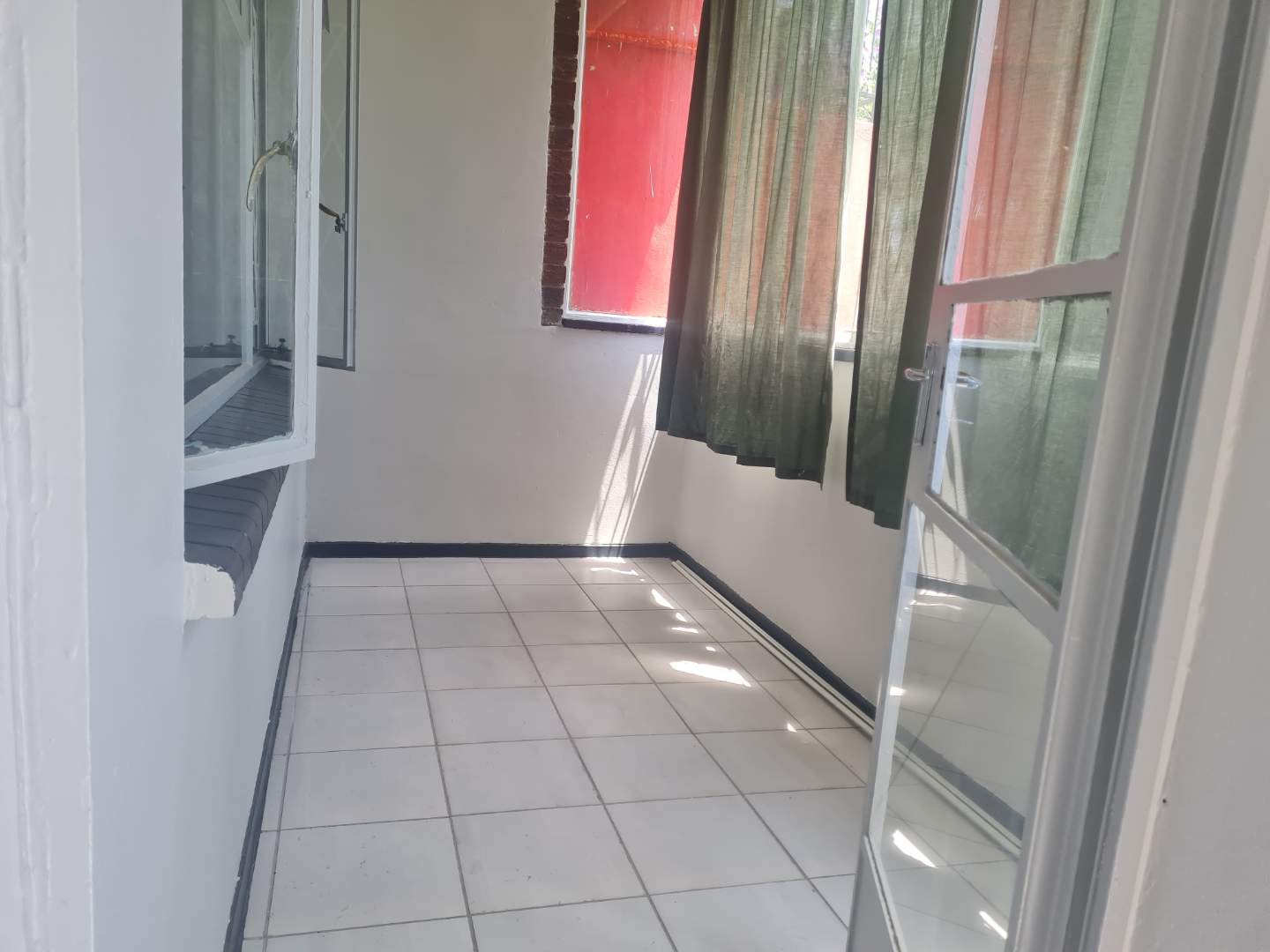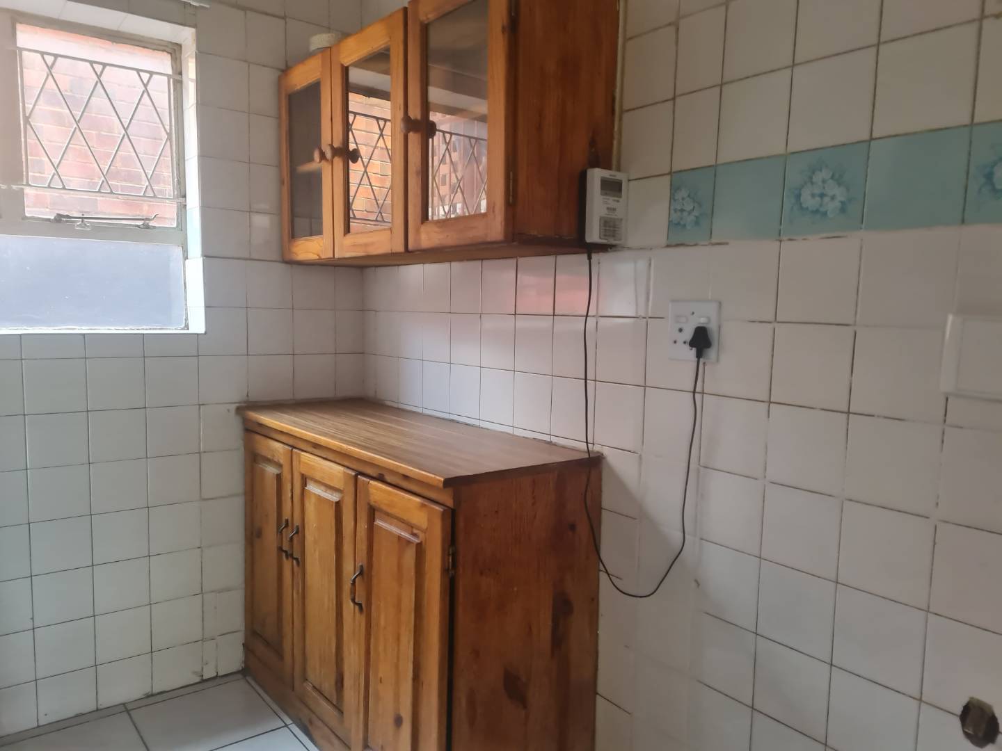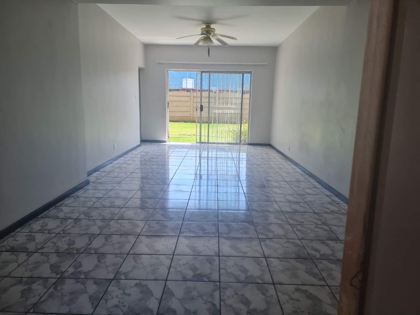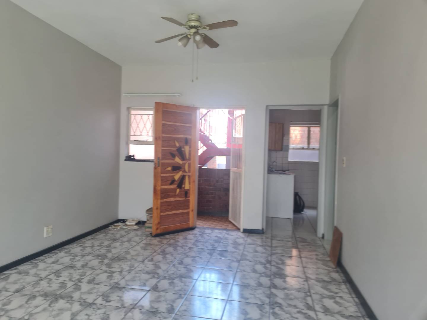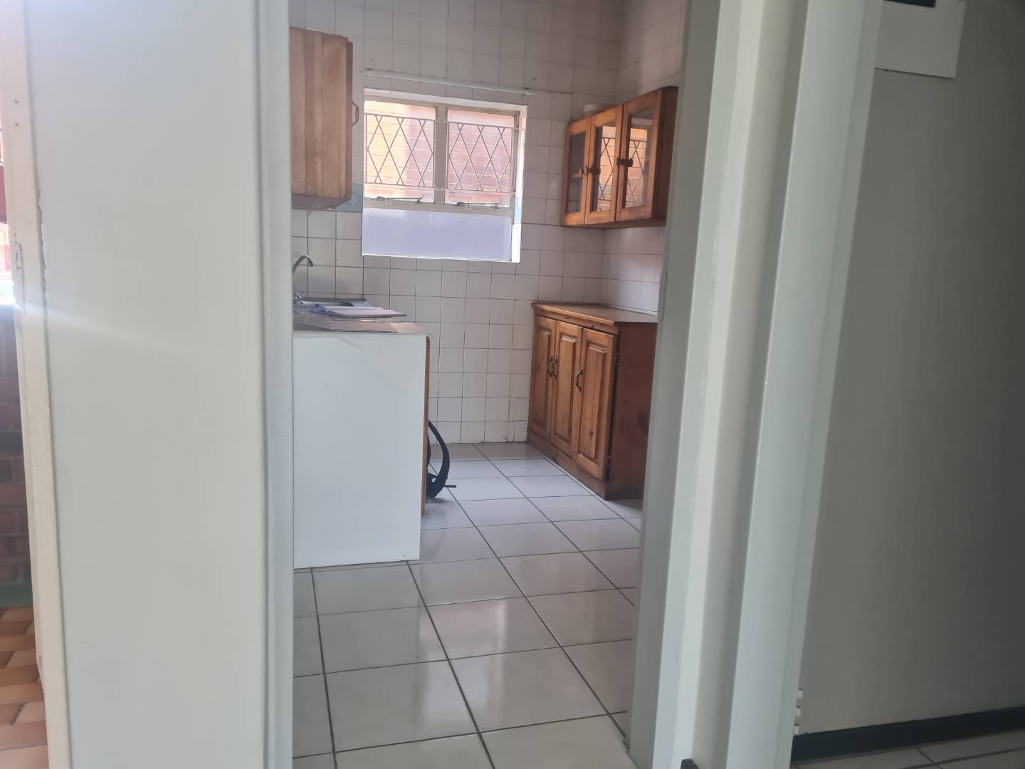 The generous open-plan living area combines a dining space and lounge, both adorned with sleek tile flooring, perfect for hosting gatherings or unwinding after a long day. The kitchen is with melamine cupboards.