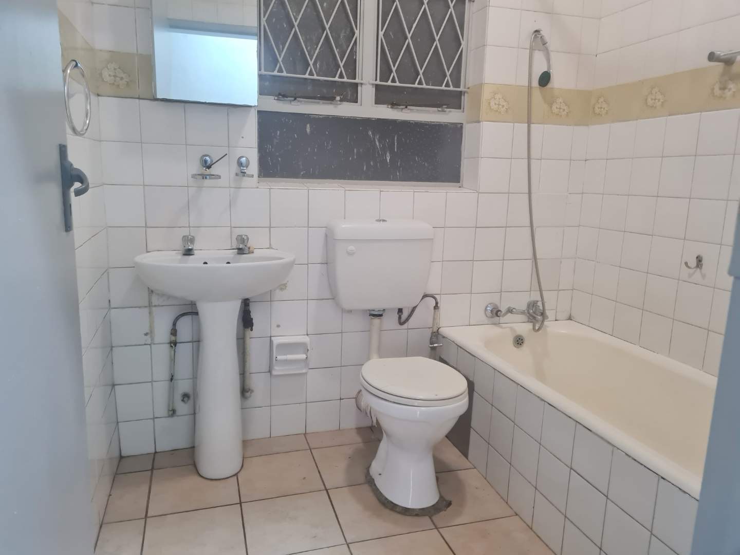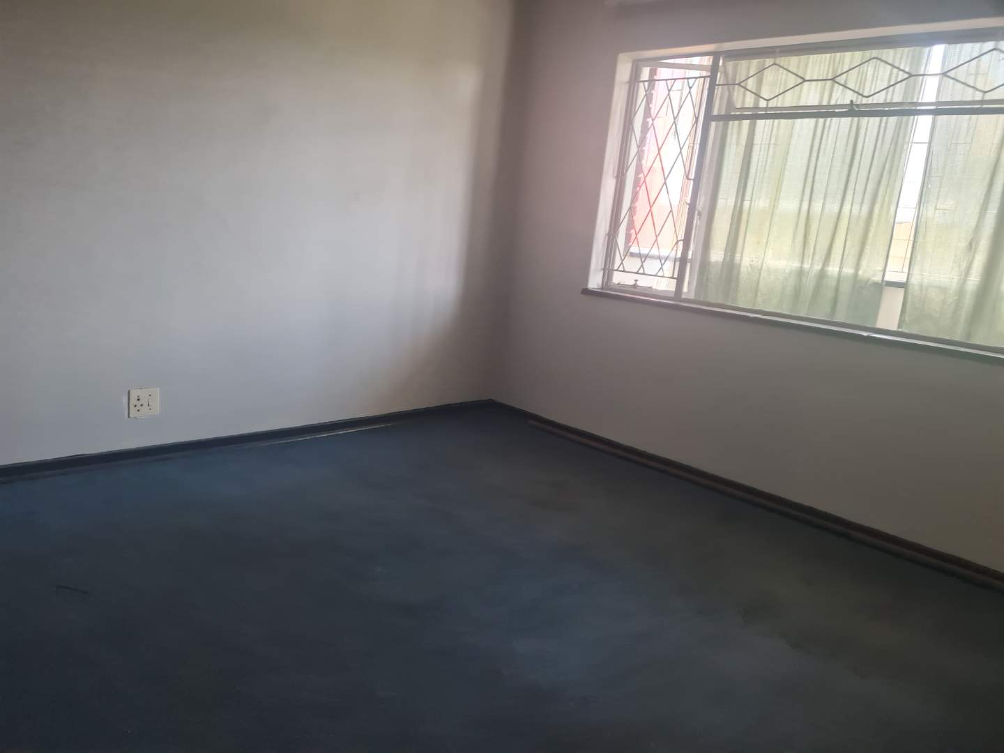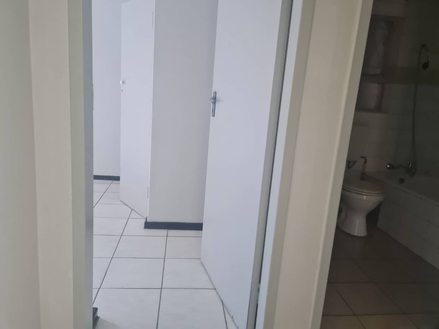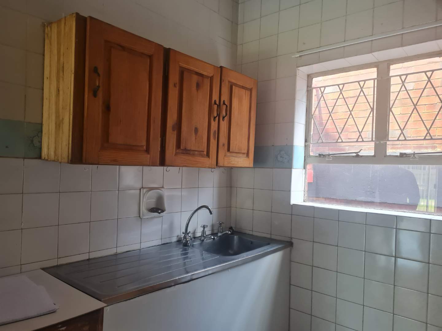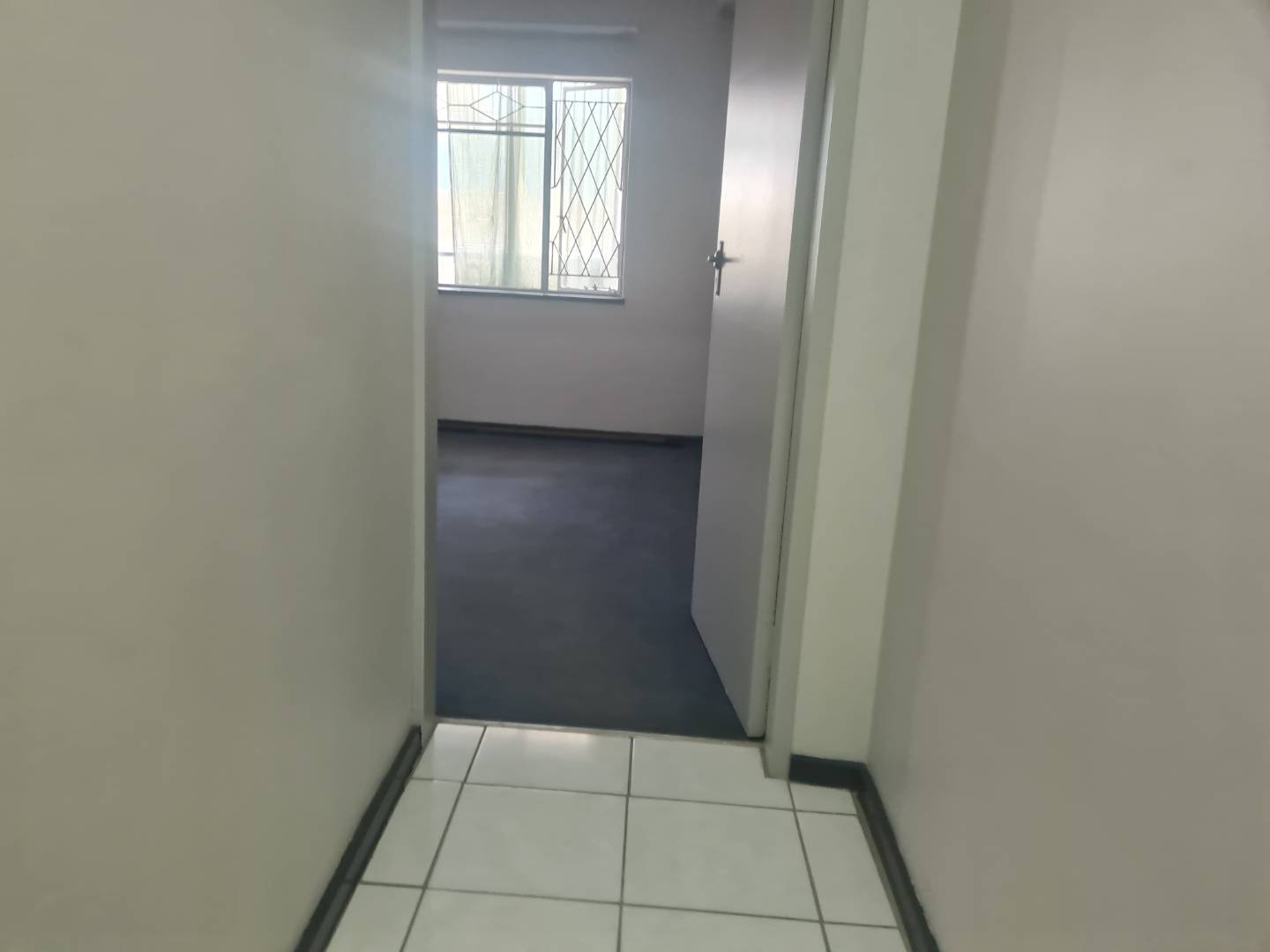 The generous open-plan living area combines a dining space and lounge, both adorned with sleek tile flooring, perfect for hosting gatherings or unwinding after a long day. The kitchen is with melamine cupboards.