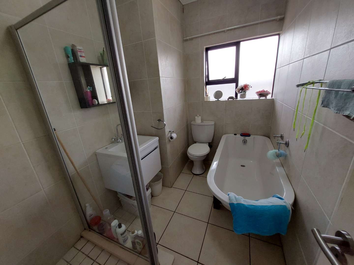 The unit boasts 1 full modern bathroom and 2 spacious bedrooms, each equipped with ample built-in cupboards to cater to all your storage needs. The entire unit is fully tiled, providing a sleek and contemporary finish throughout.