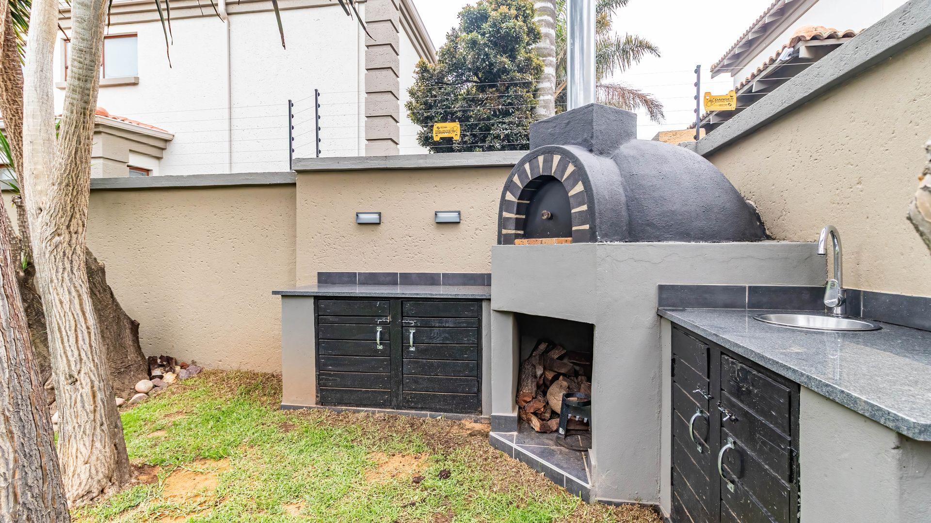 The heart of the home is the open-plan kitchen, complete with a walk-in pantry and a separate scullery. This culinary space flows seamlessly into a large dining and lounge area, which opens through sliding doors onto a covered patio. Here, you’ll find a built-in braai and a delightful pizza oven, perfect for entertaining in the expansive, pet-friendly garden.