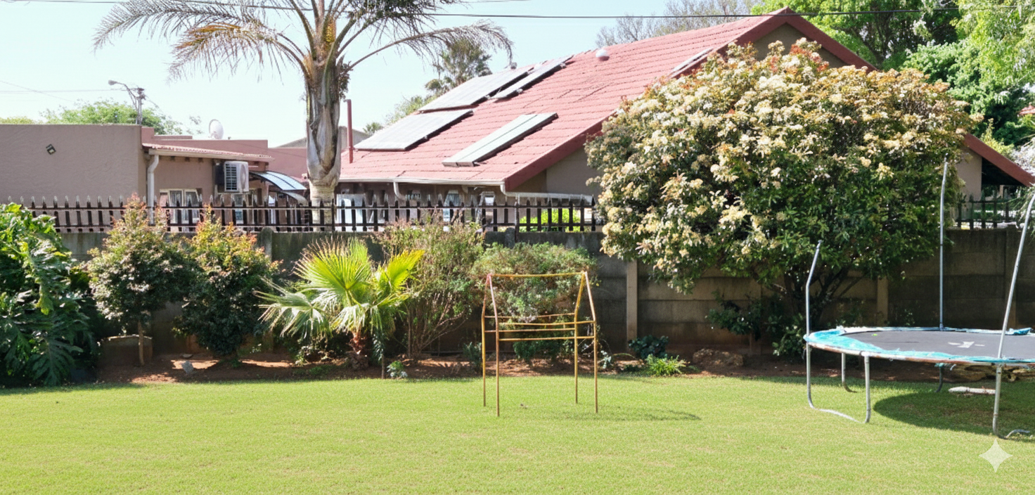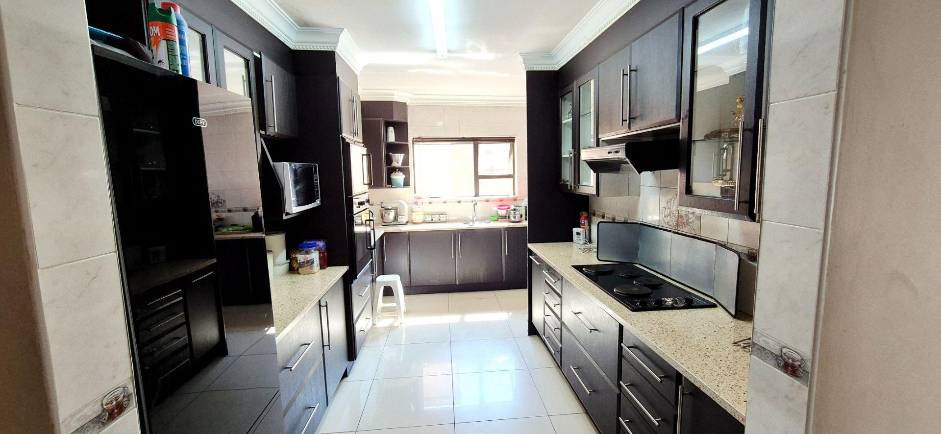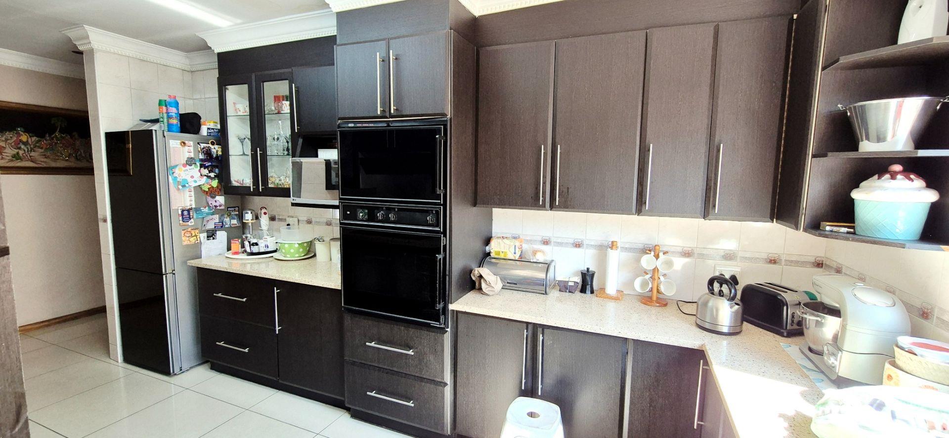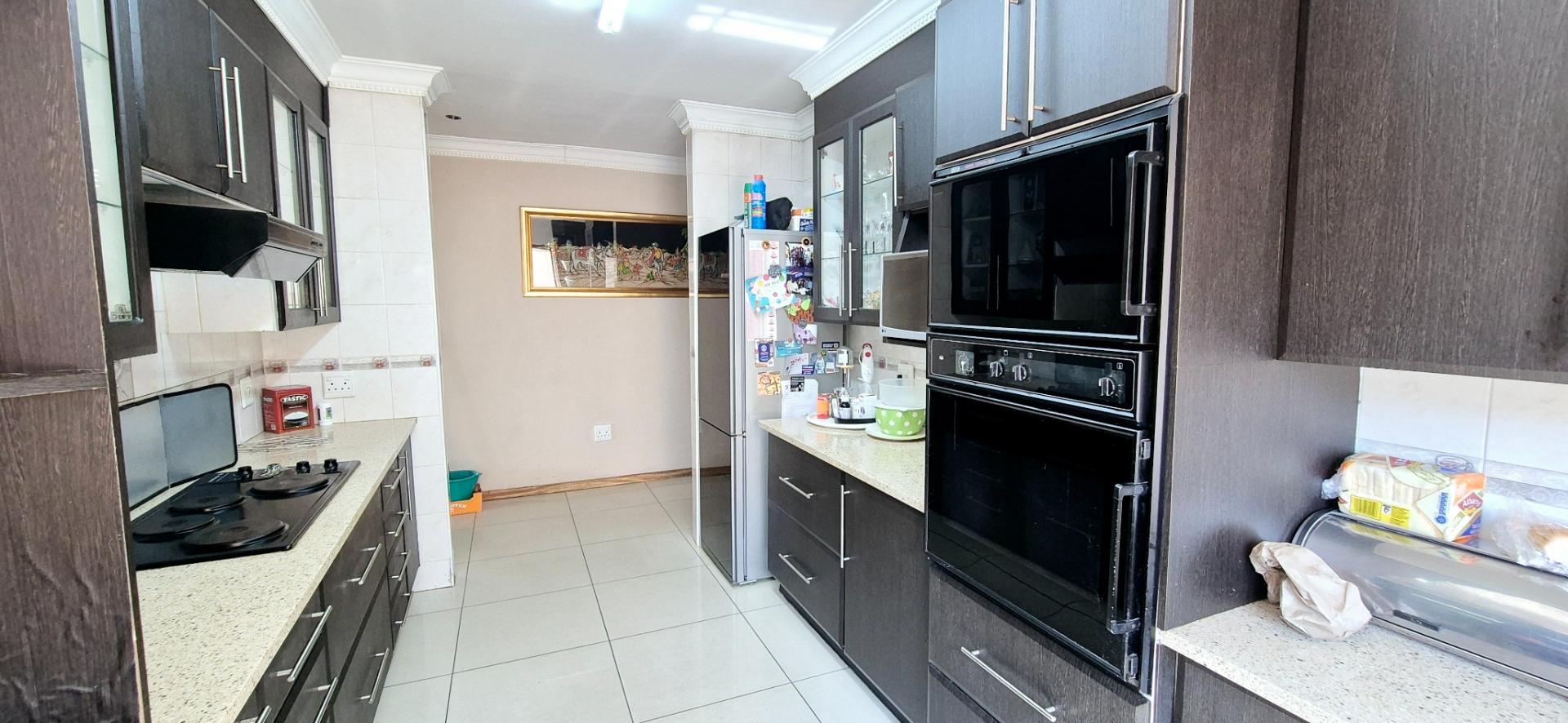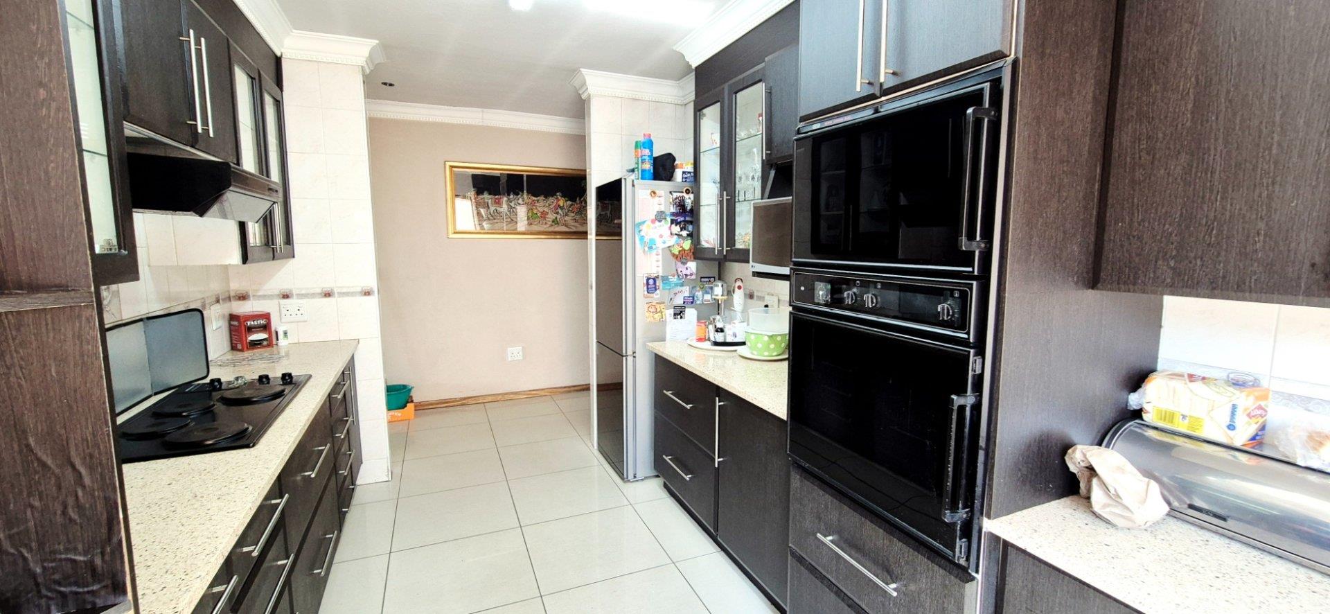 The home features three generously sized bedrooms, each equipped with built-in cupboards. The master bedroom boasts an ensuite bathroom, providing a private retreat for relaxation. Additionally, a full family bathroom, complete with a bath and shower, ensures everyday ease for all family members. The upmarket spacious kitchen, adorned with caesarstone countertops and a scullery, flows effortlessly into the dining and lounge areas, creating an ideal hub for family gatherings and daily living.