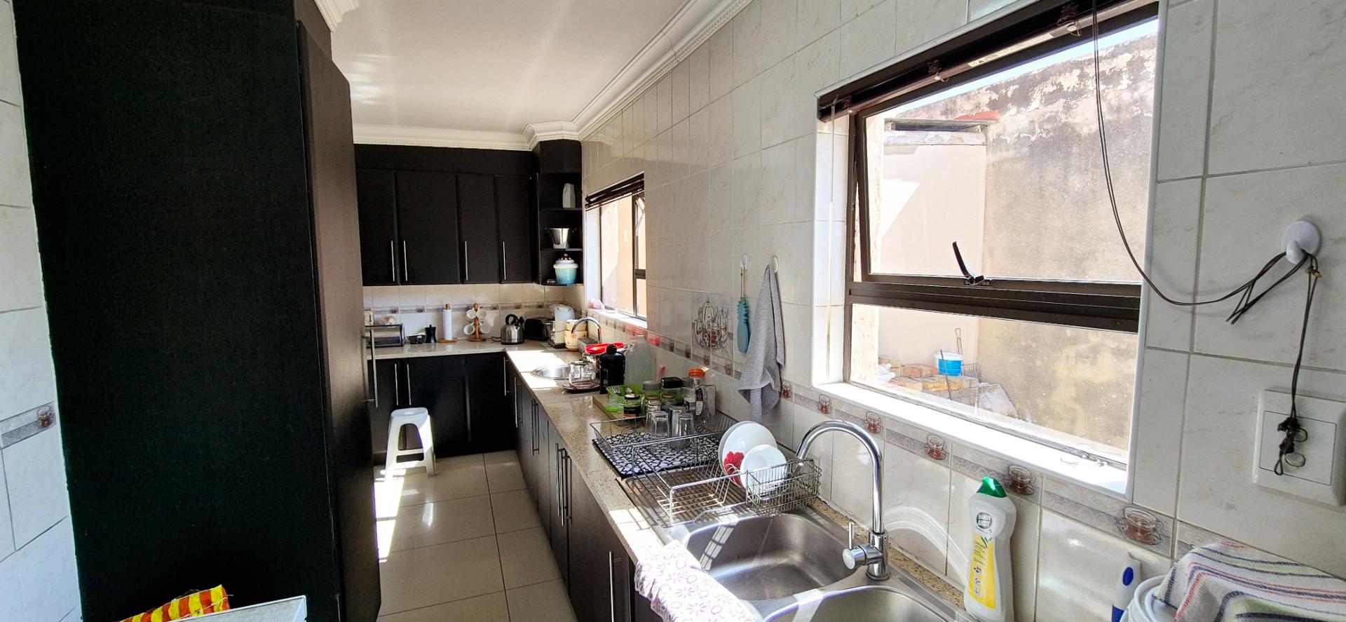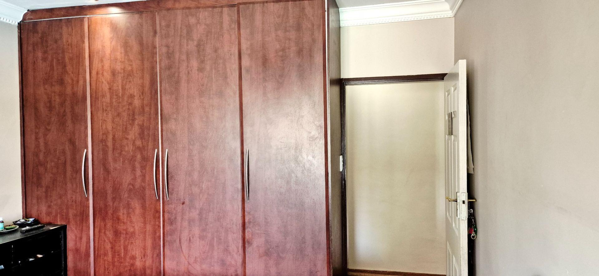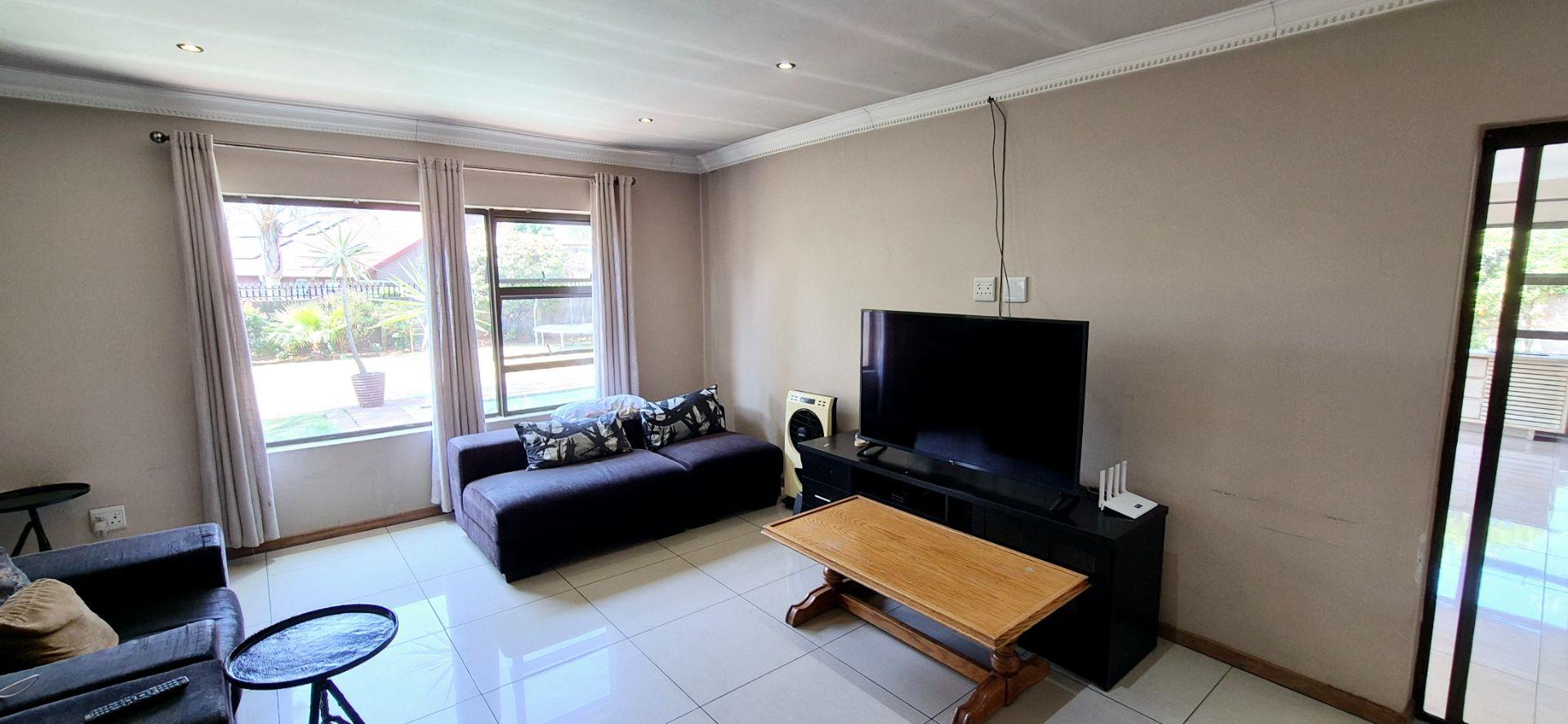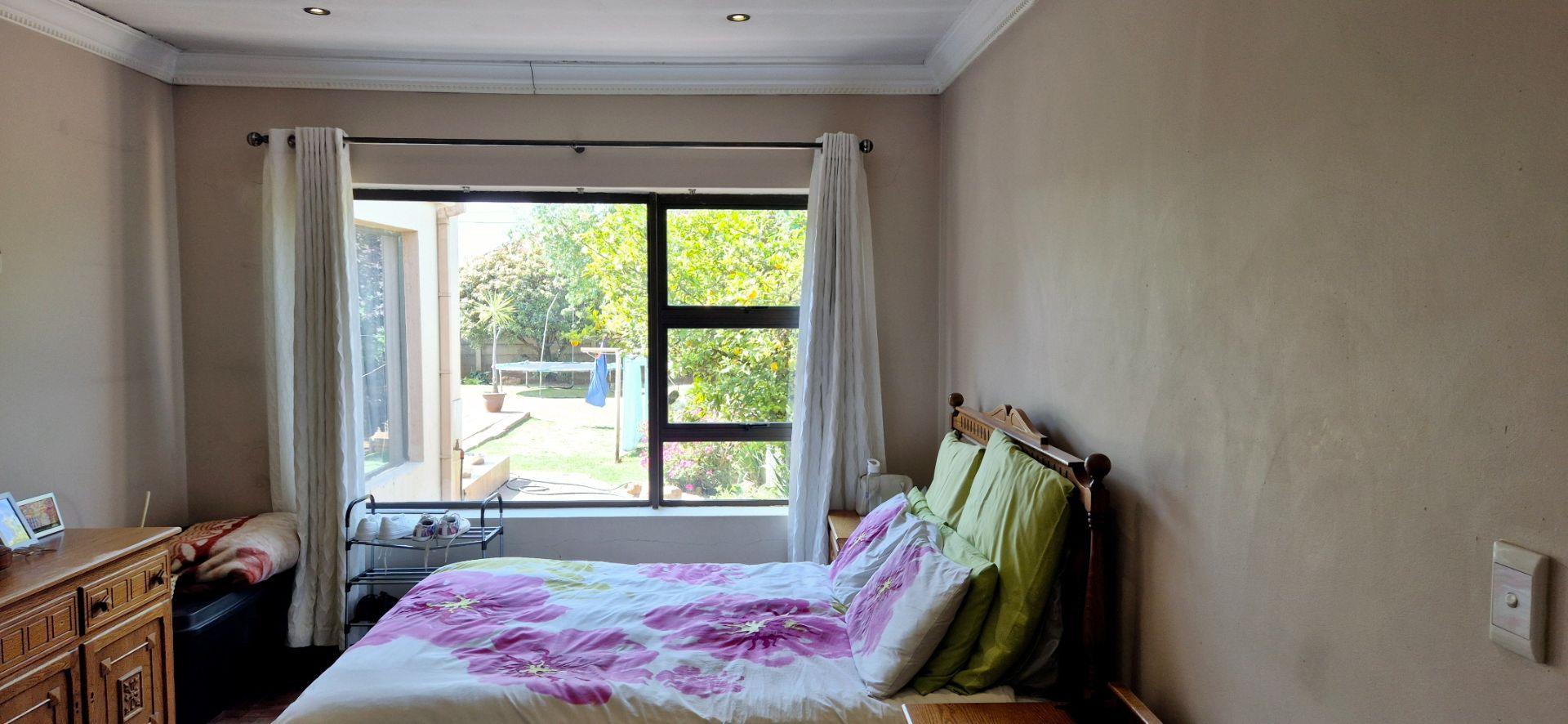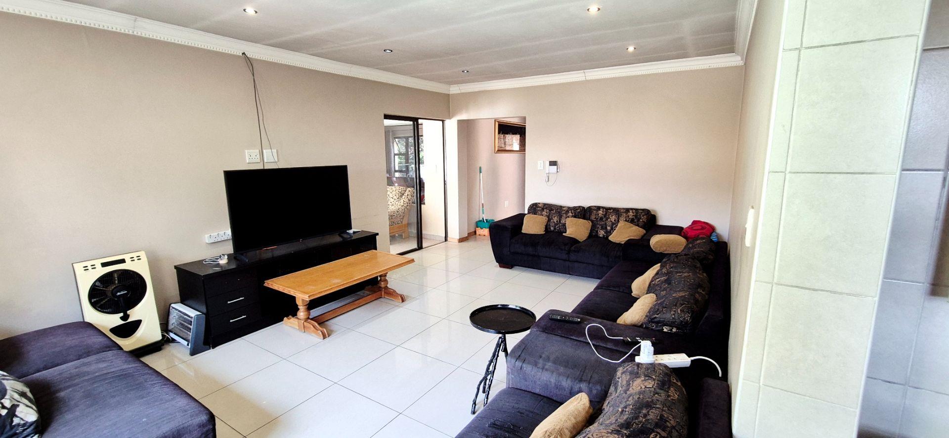 The home features three generously sized bedrooms, each equipped with built-in cupboards. The master bedroom boasts an ensuite bathroom, providing a private retreat for relaxation. Additionally, a full family bathroom, complete with a bath and shower, ensures everyday ease for all family members. The upmarket spacious kitchen, adorned with caesarstone countertops and a scullery, flows effortlessly into the dining and lounge areas, creating an ideal hub for family gatherings and daily living.