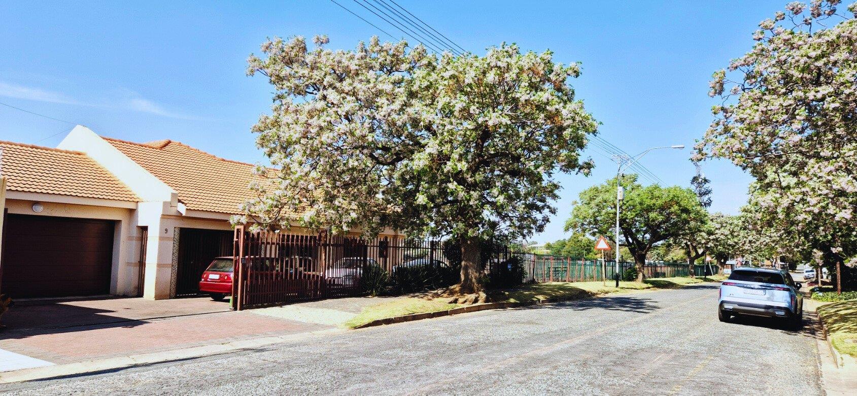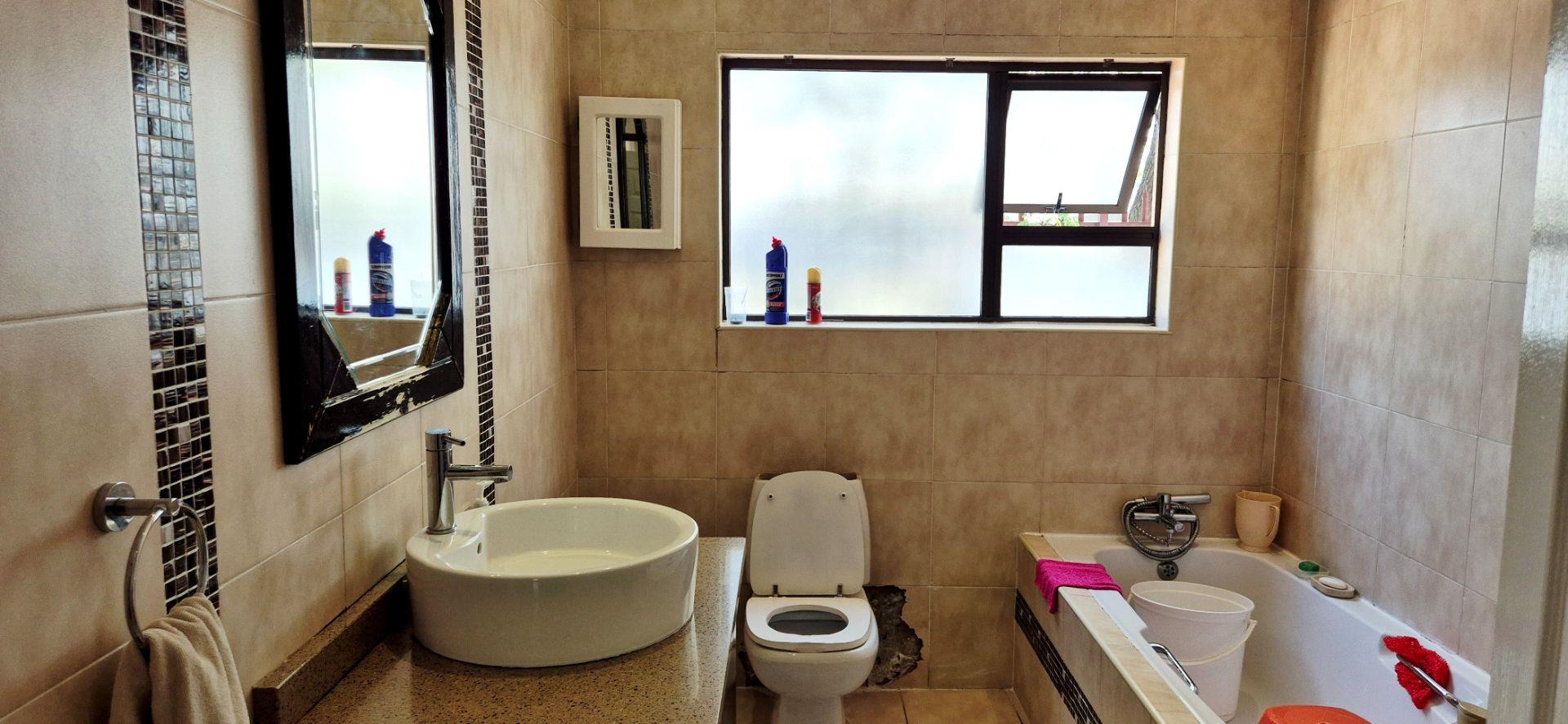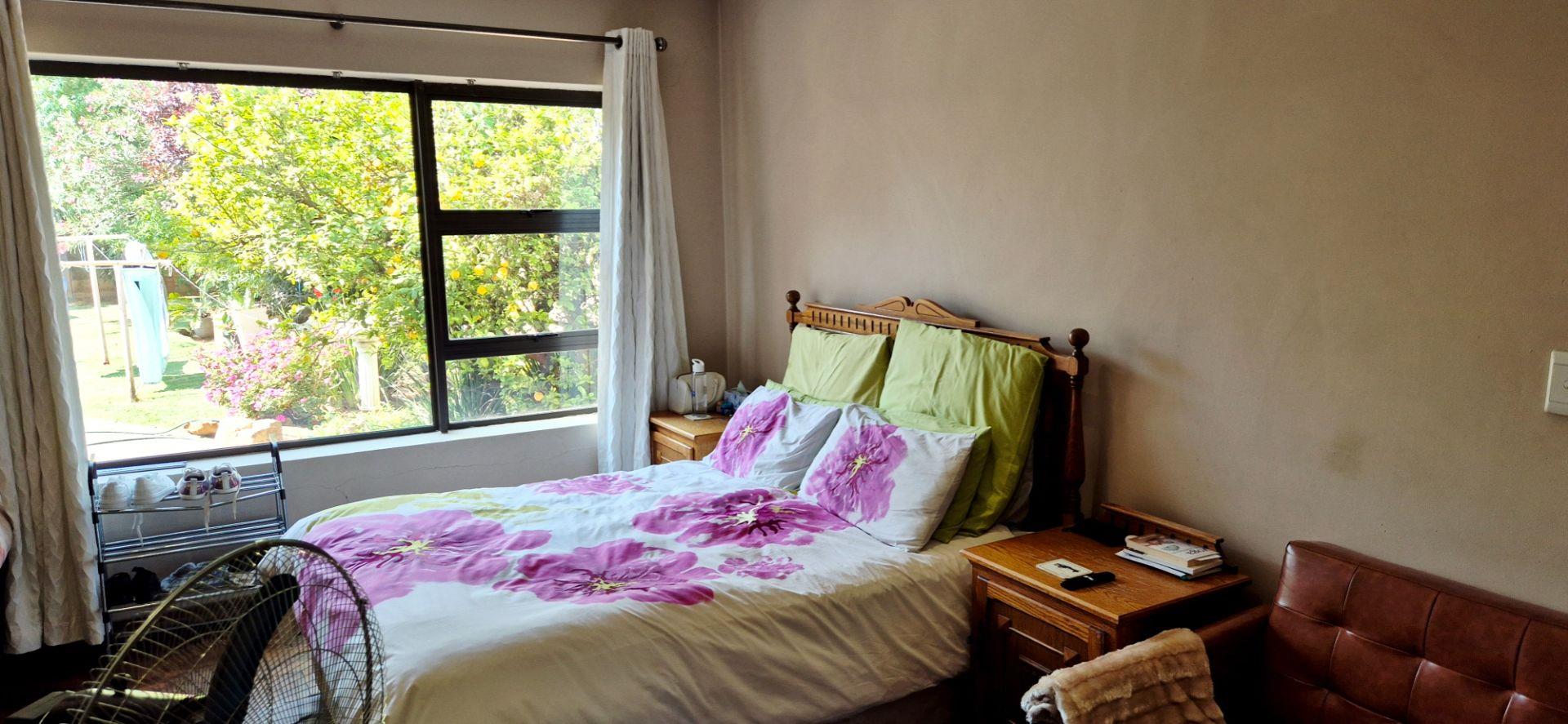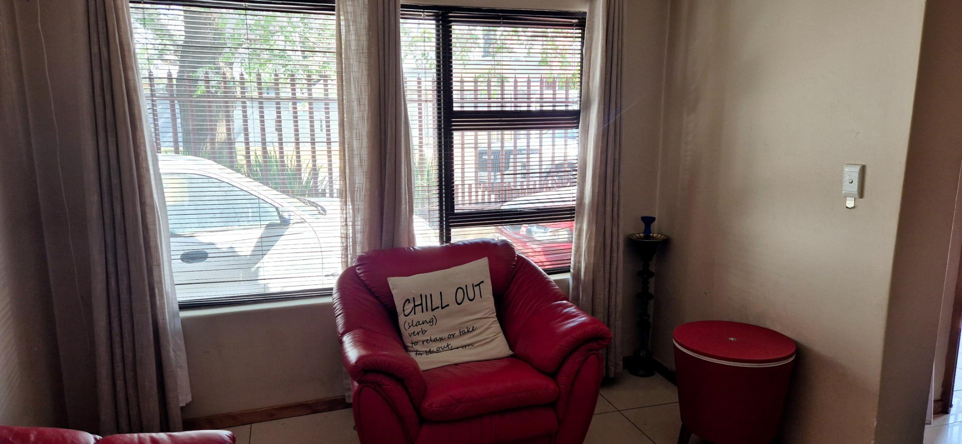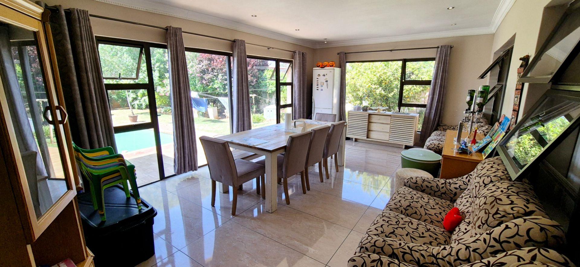 The home features three generously sized bedrooms, each equipped with built-in cupboards. The master bedroom boasts an ensuite bathroom, providing a private retreat for relaxation. Additionally, a full family bathroom, complete with a bath and shower, ensures everyday ease for all family members. The upmarket spacious kitchen, adorned with caesarstone countertops and a scullery, flows effortlessly into the dining and lounge areas, creating an ideal hub for family gatherings and daily living.