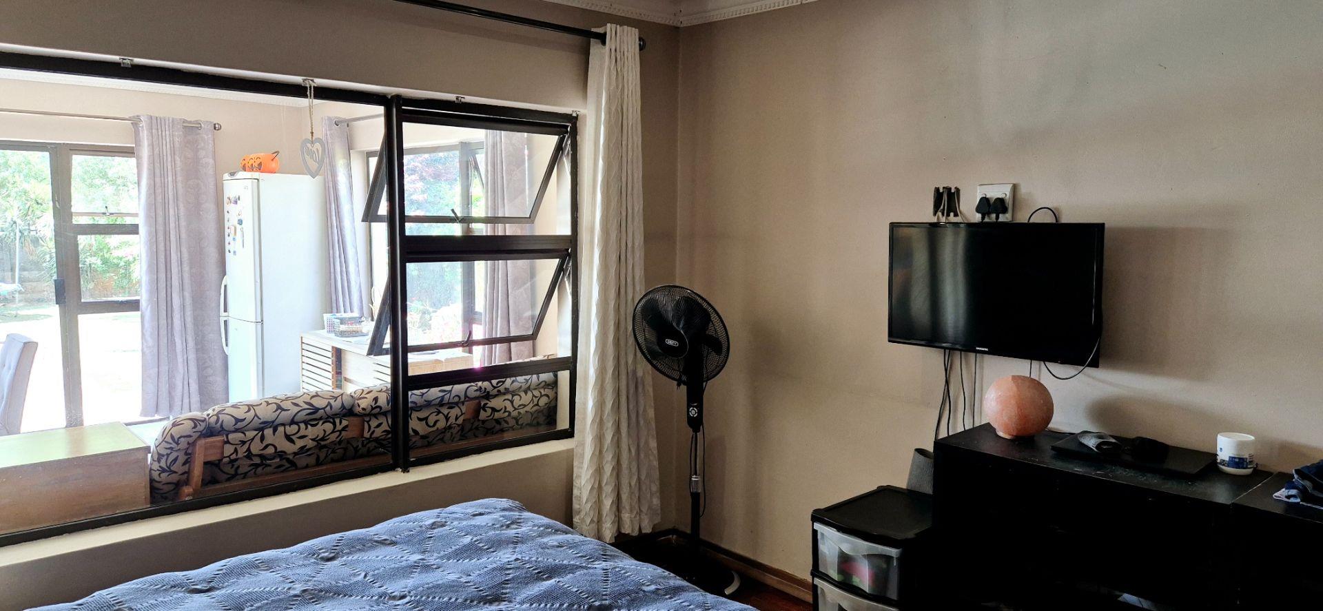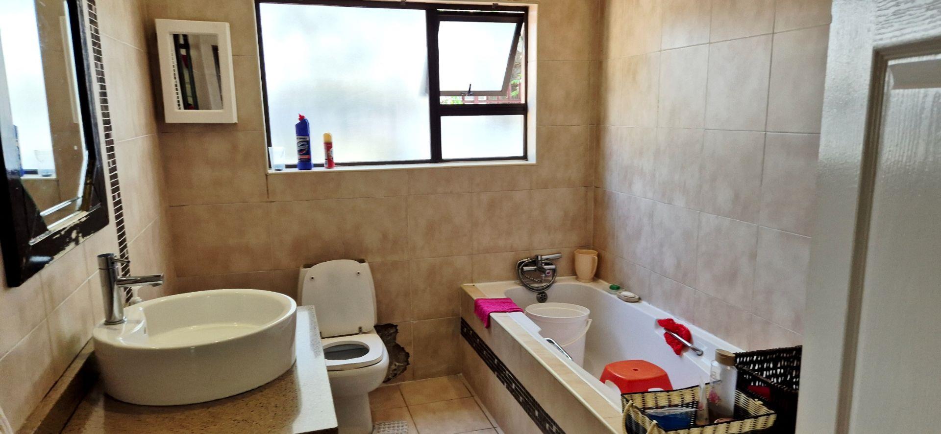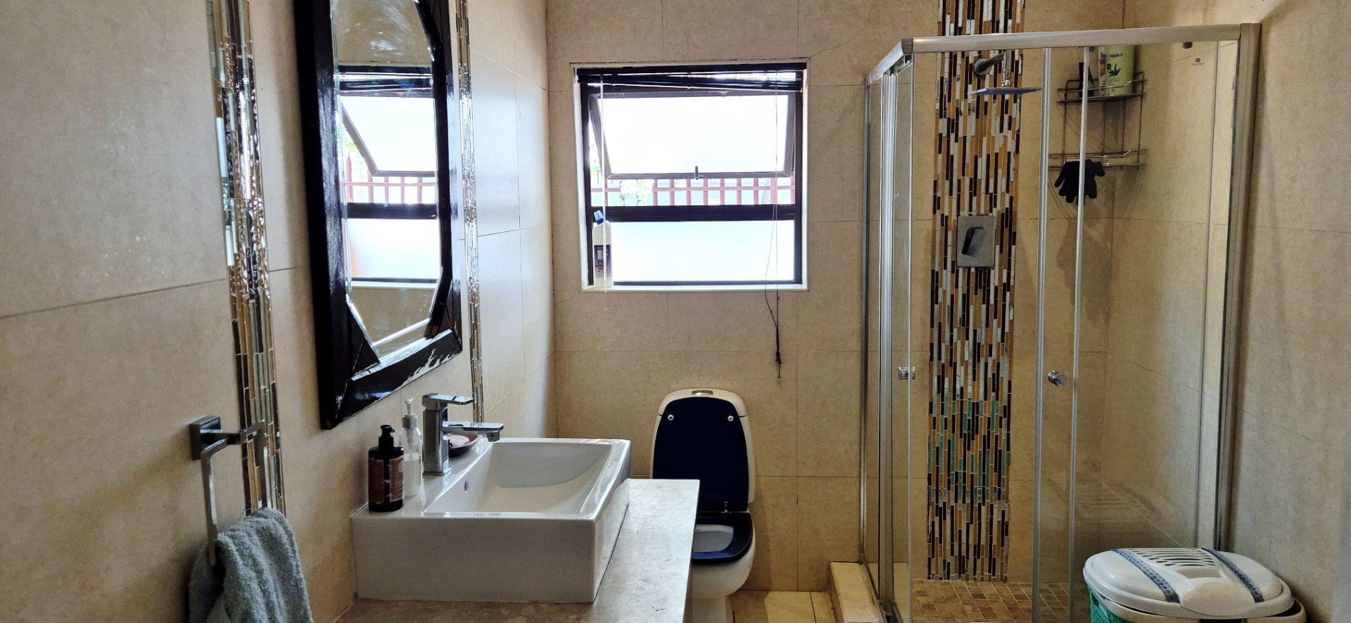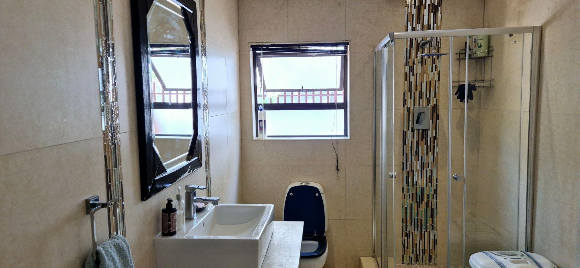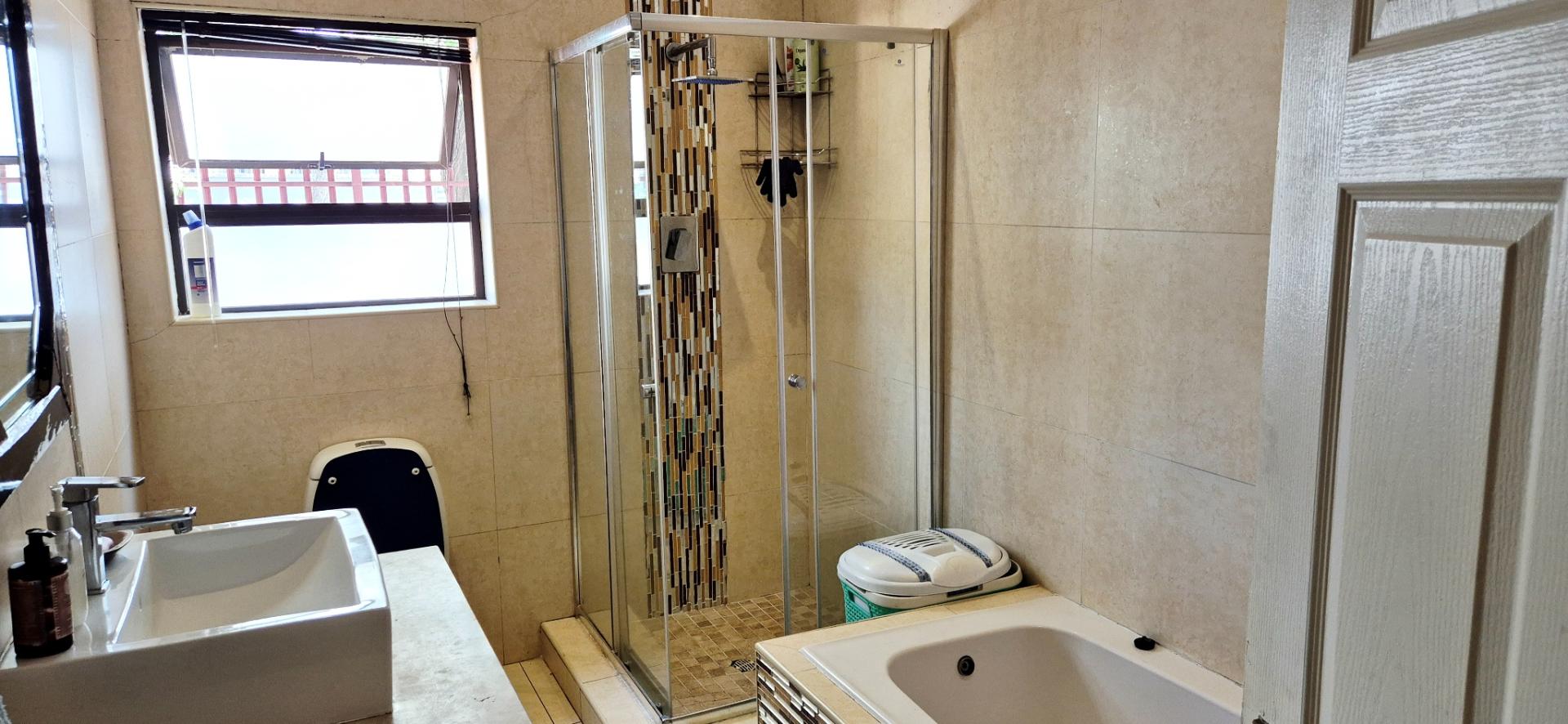 The home features three generously sized bedrooms, each equipped with built-in cupboards. The master bedroom boasts an ensuite bathroom, providing a private retreat for relaxation. Additionally, a full family bathroom, complete with a bath and shower, ensures everyday ease for all family members. The upmarket spacious kitchen, adorned with caesarstone countertops and a scullery, flows effortlessly into the dining and lounge areas, creating an ideal hub for family gatherings and daily living.