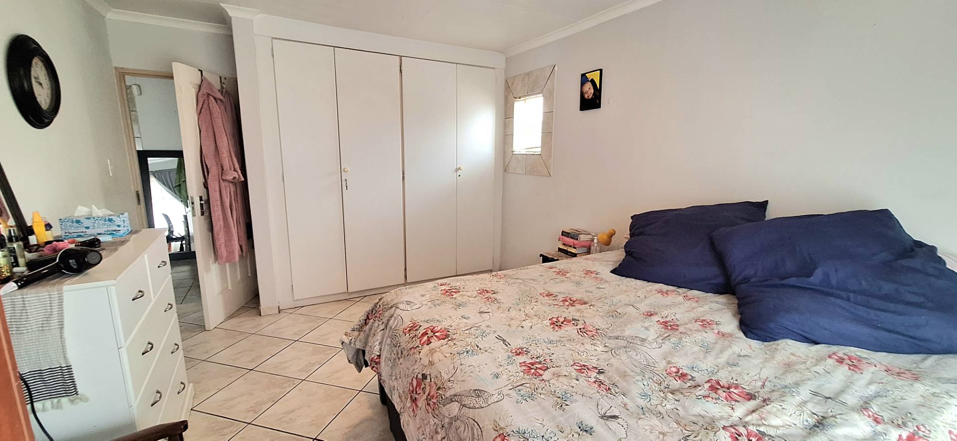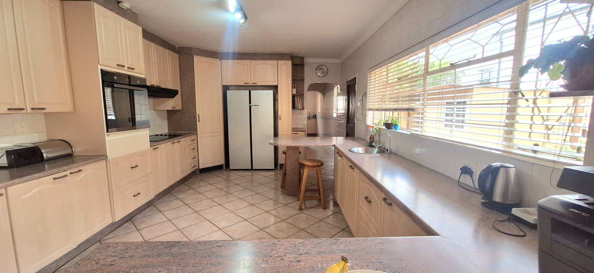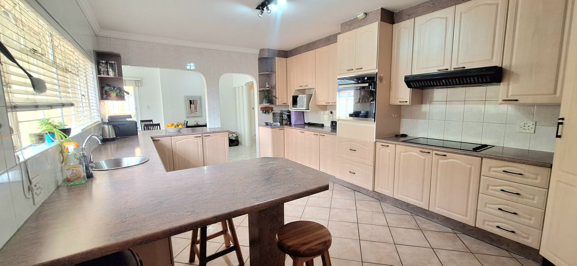 As you step inside, you are greeted by an inviting open-plan dining and lounge area, ideal for both daily living and entertaining guests. The huge kitchen is a chef’s delight, featuring ample cupboard space, a scullery, melamine countertops, and an eye-level oven. Each of the four spacious bedrooms is equipped with built-in cupboards, providing plenty of storage. The property boasts two well-appointed bathrooms, with the main en-suite offering a bath, basin, and toilet for your convenience.