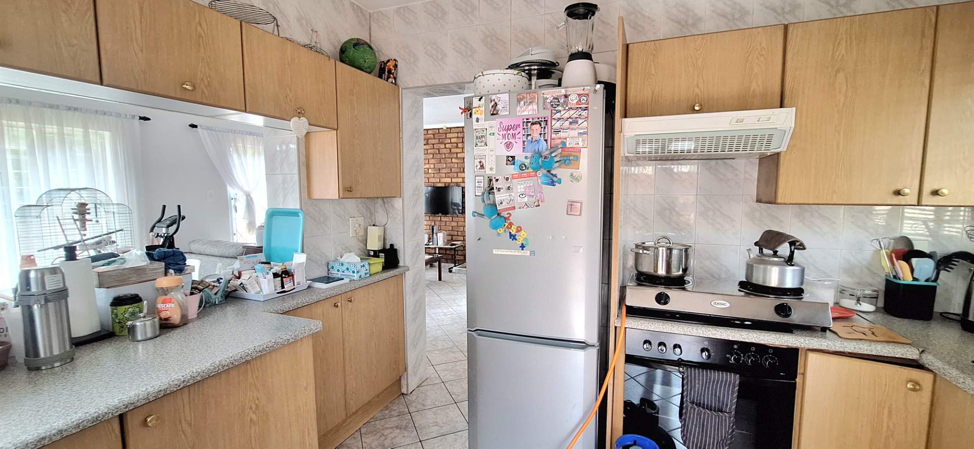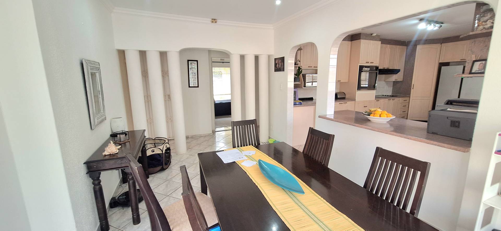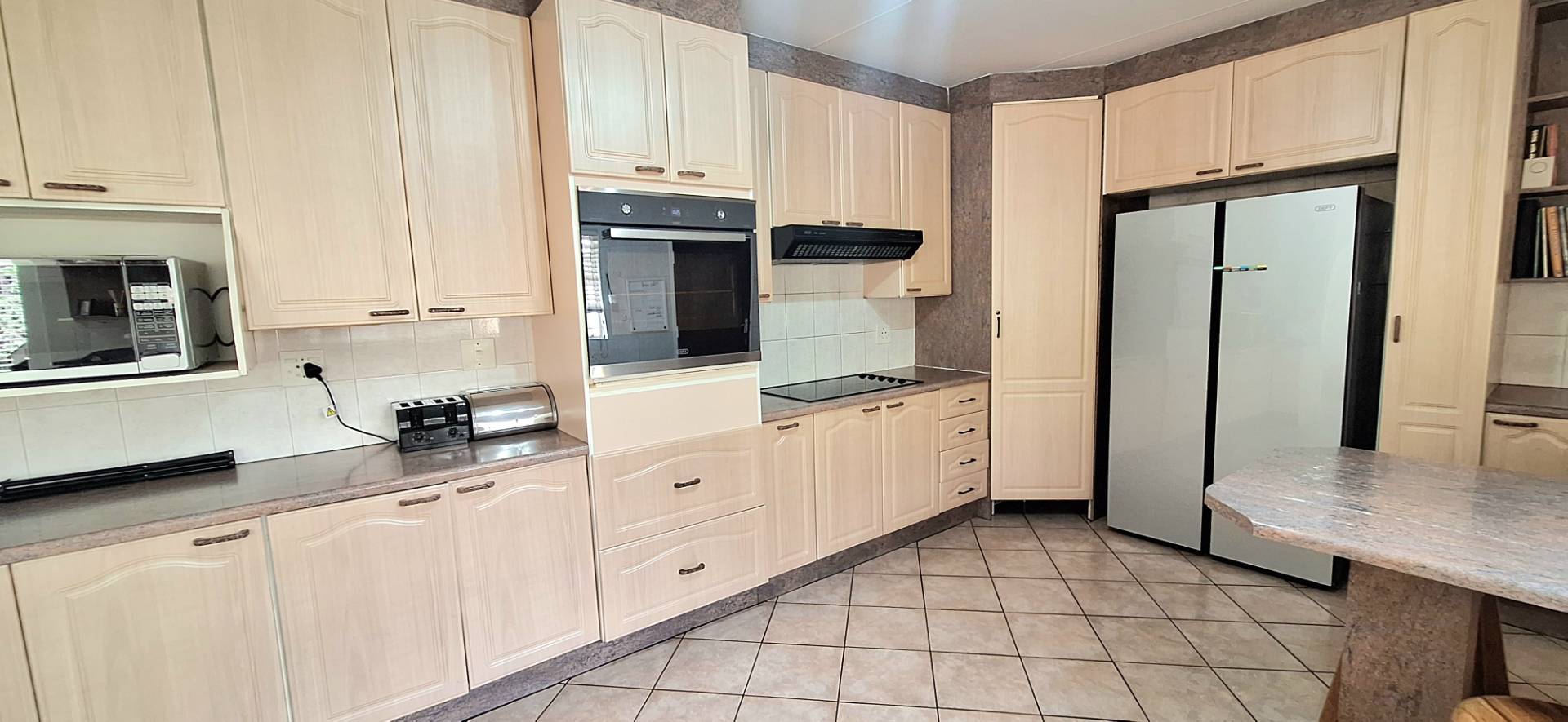 As you step inside, you are greeted by an inviting open-plan dining and lounge area, ideal for both daily living and entertaining guests. The huge kitchen is a chef’s delight, featuring ample cupboard space, a scullery, melamine countertops, and an eye-level oven. Each of the four spacious bedrooms is equipped with built-in cupboards, providing plenty of storage. The property boasts two well-appointed bathrooms, with the main en-suite offering a bath, basin, and toilet for your convenience.