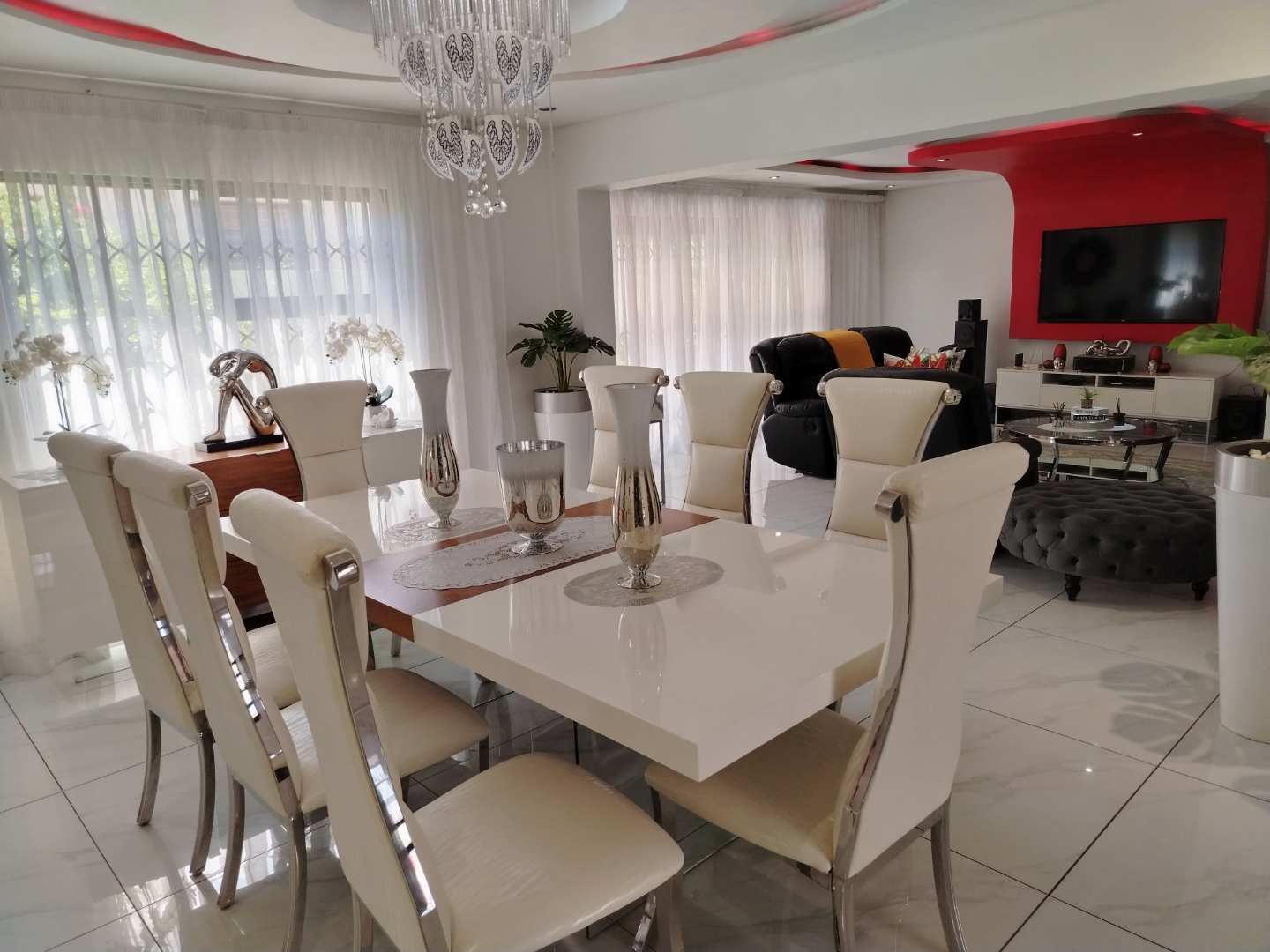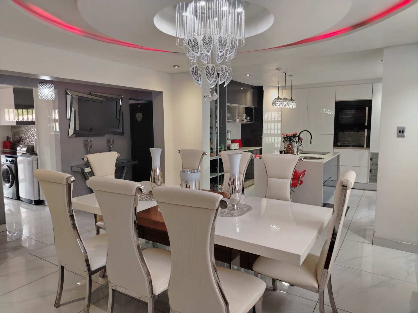 The open-plan design seamlessly integrates the dining room and stylish lounge, creating a sophisticated space ideal for entertaining guests or enjoying quiet family dinners.