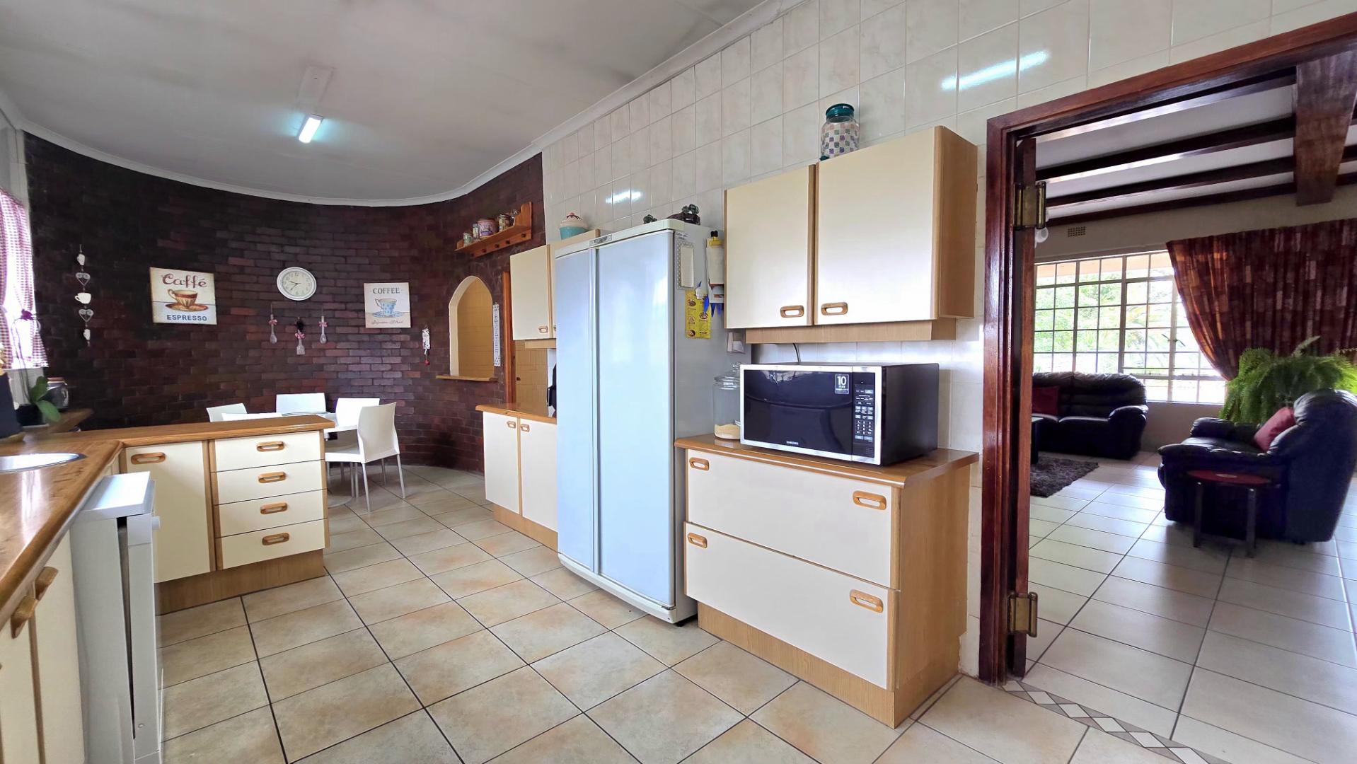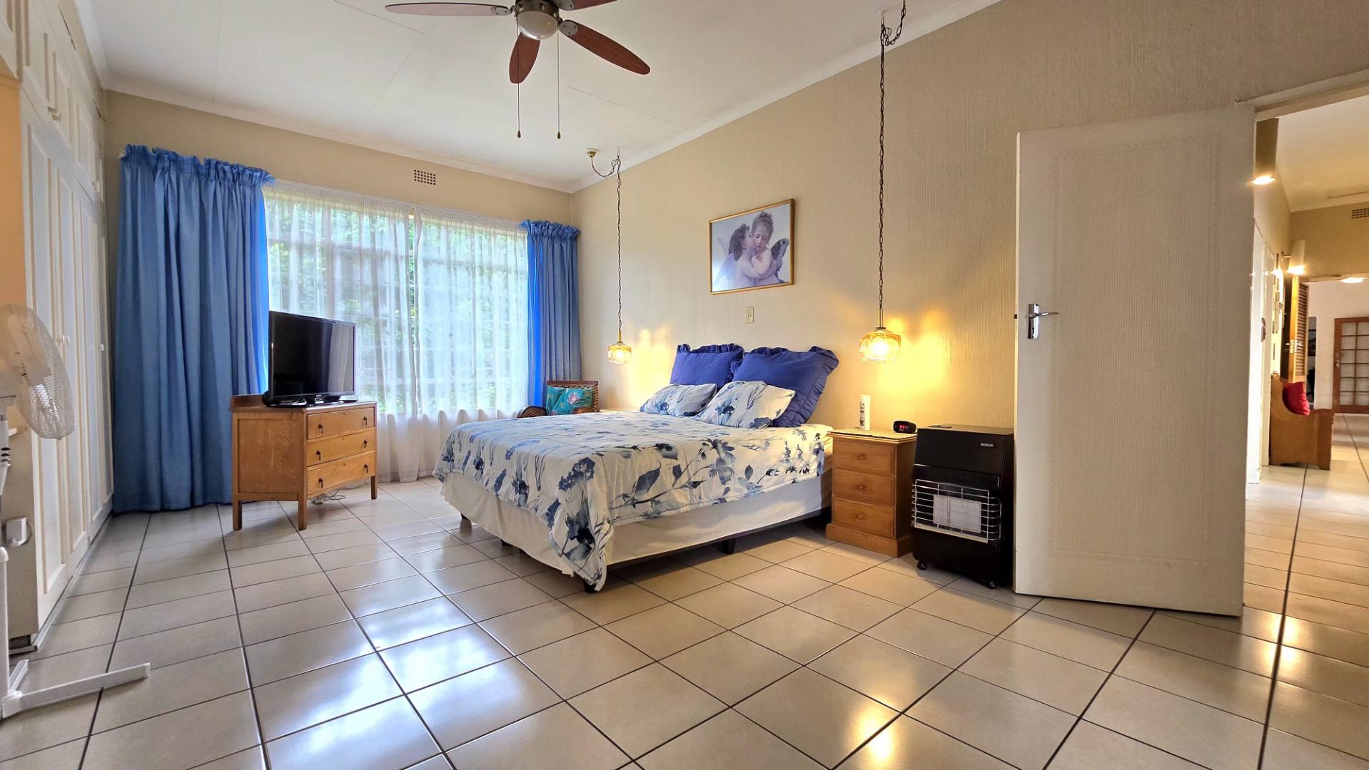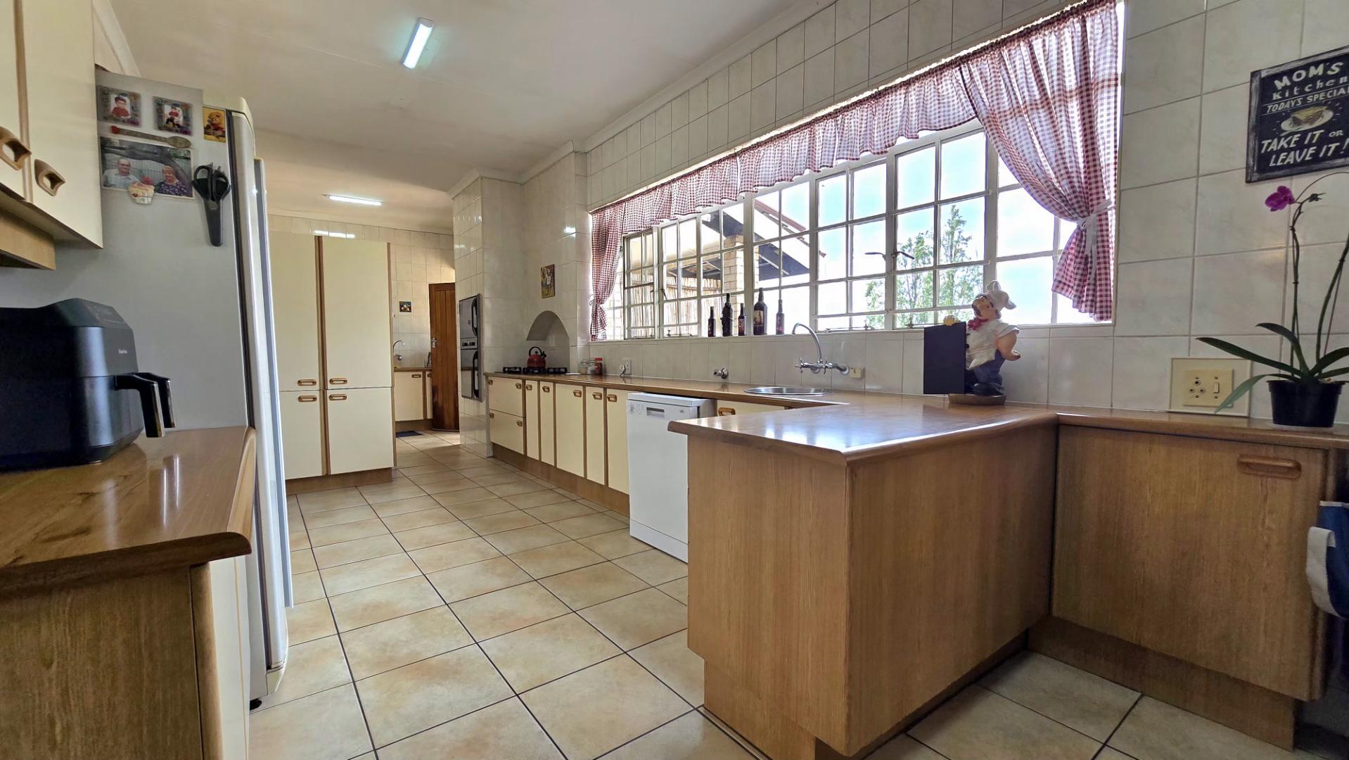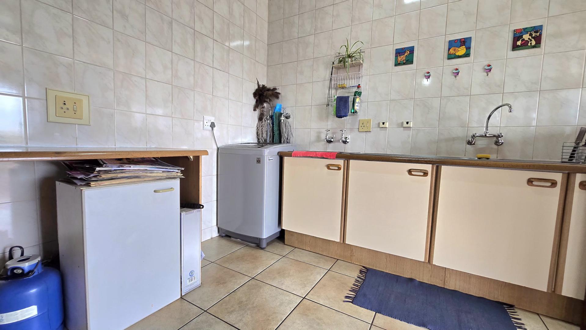 The fully fitted kitchen is a chef’s delight, boasting ample built-in cupboards, mica countertops, a Whirlpool 5-plate gas hob, and two Defy eye-level ovens. There’s space for a dishwasher, ensuring easy clean-ups after meals. A separate tiled laundry and scullery provide additional space for a washing machine and tumble dryer and offer direct access to the large patio with an outside toilet.