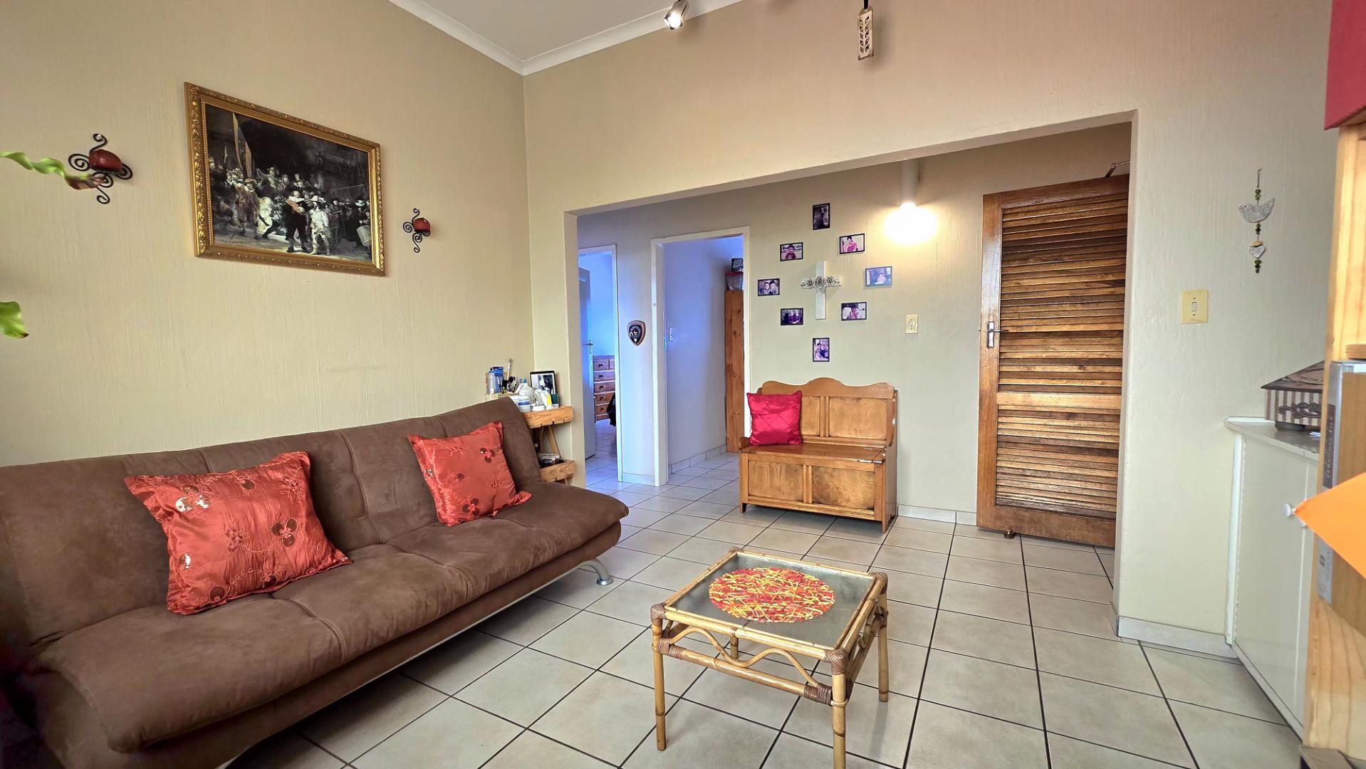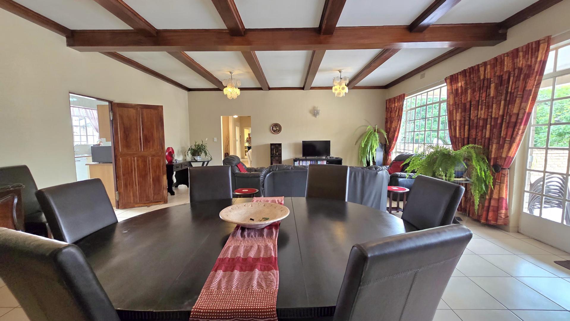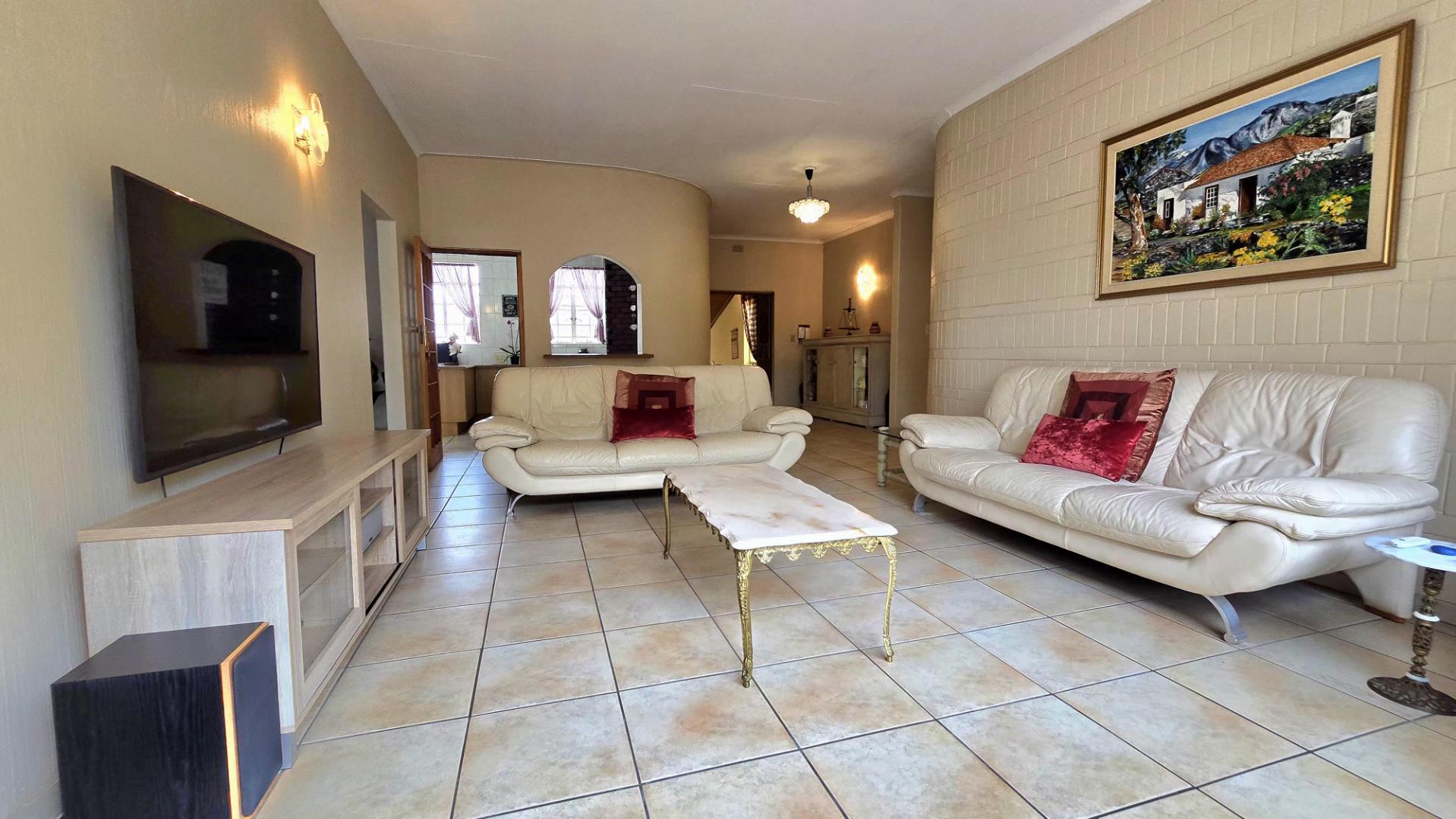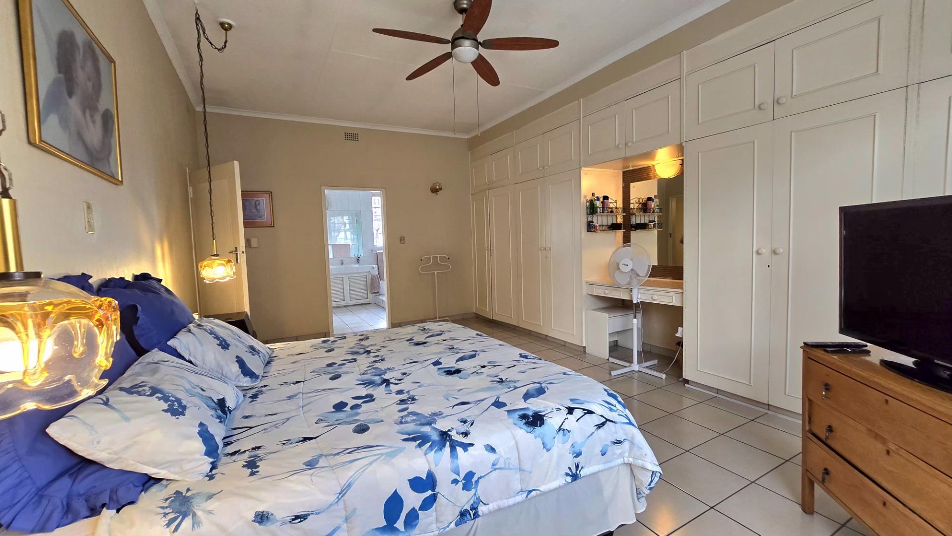 The fully fitted kitchen is a chef’s delight, boasting ample built-in cupboards, mica countertops, a Whirlpool 5-plate gas hob, and two Defy eye-level ovens. There’s space for a dishwasher, ensuring easy clean-ups after meals. A separate tiled laundry and scullery provide additional space for a washing machine and tumble dryer and offer direct access to the large patio with an outside toilet.