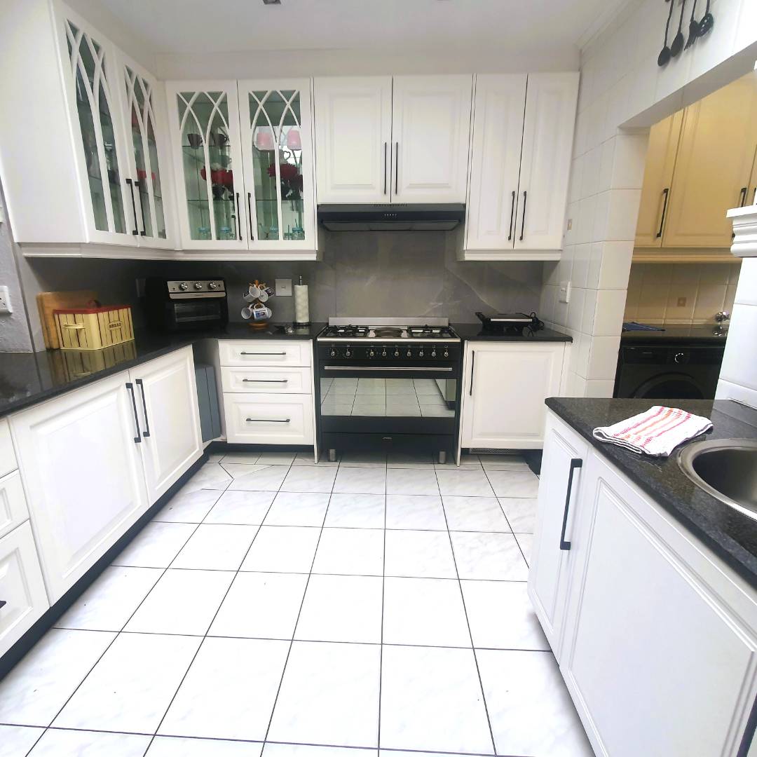 The modern kitchen with granite countertops and white cupboards, is equipped with both gas and electricity, making it a chef’s delight.