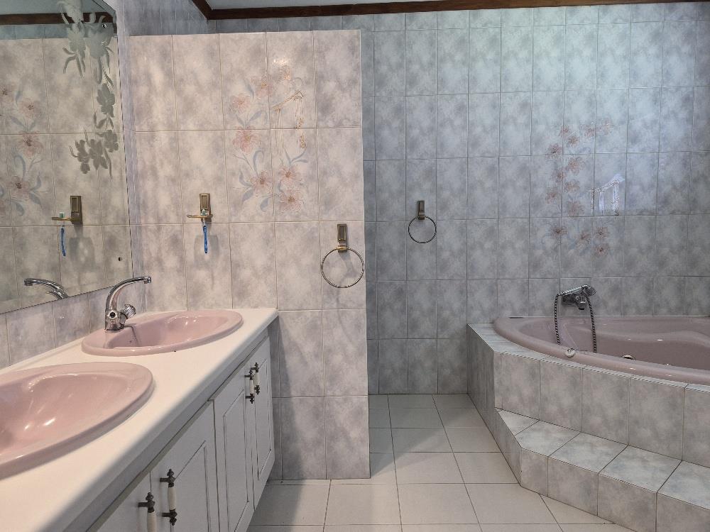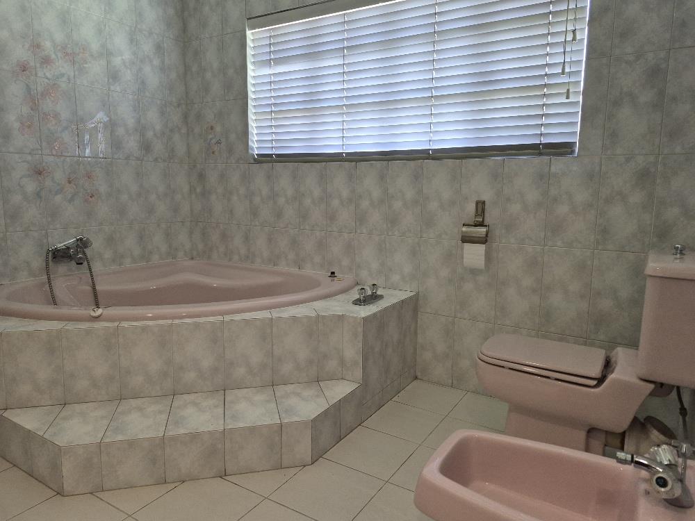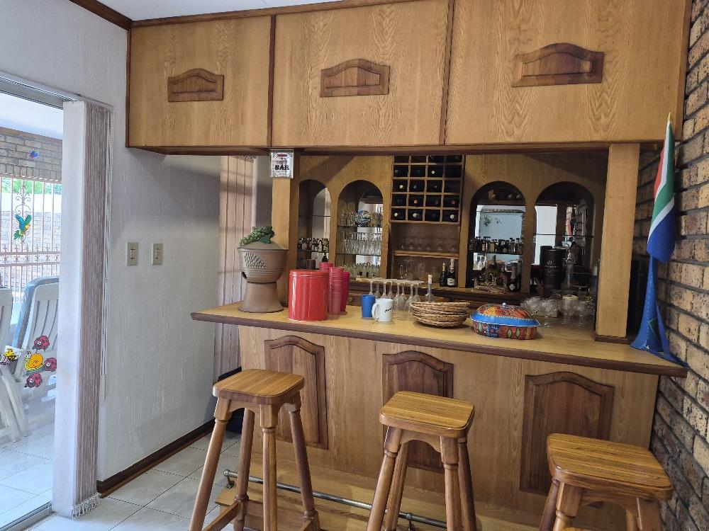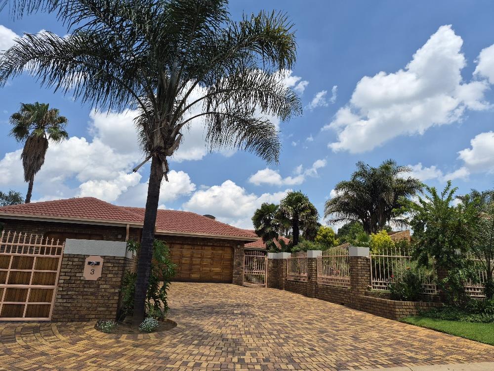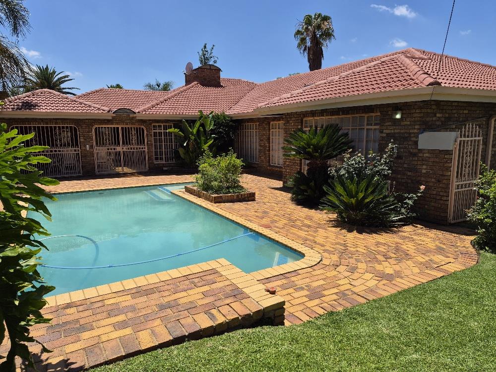 Outside, the property showcases a beautiful blue pool and meticulously manicured garden. Additional amenities include a solar geyser, helpers’ accommodation, and three motorized garages. The home is equipped with a robust security system featuring eight cameras and beams around the property.