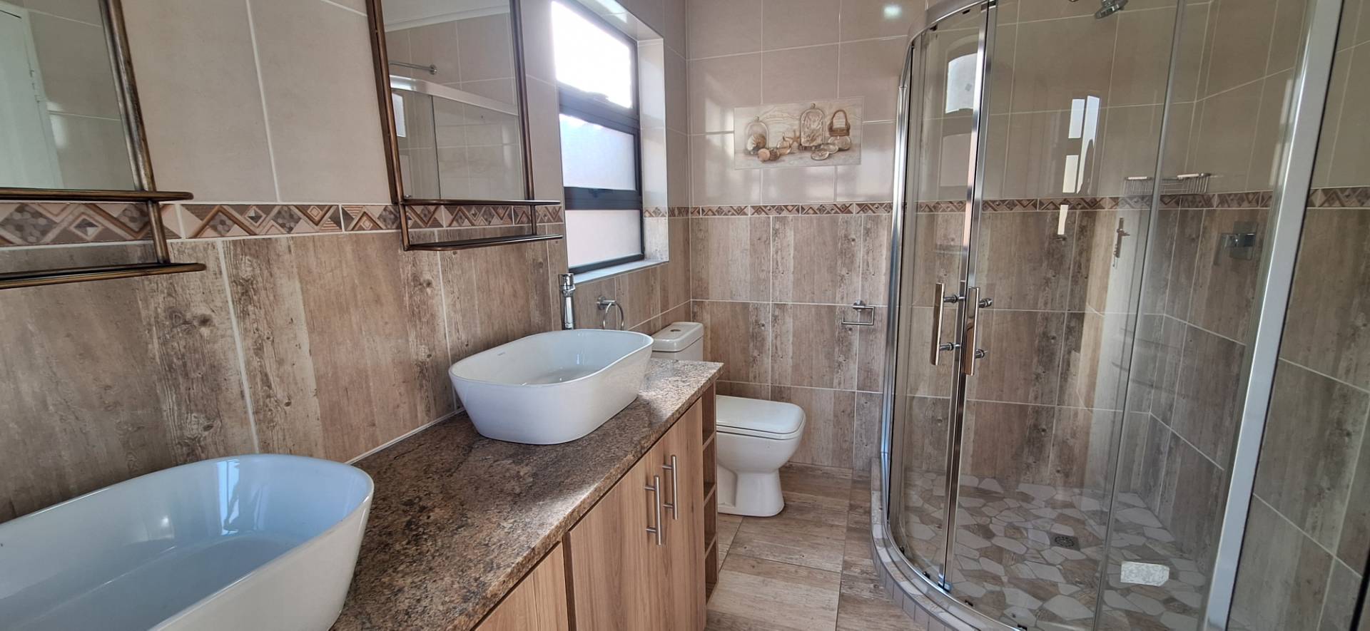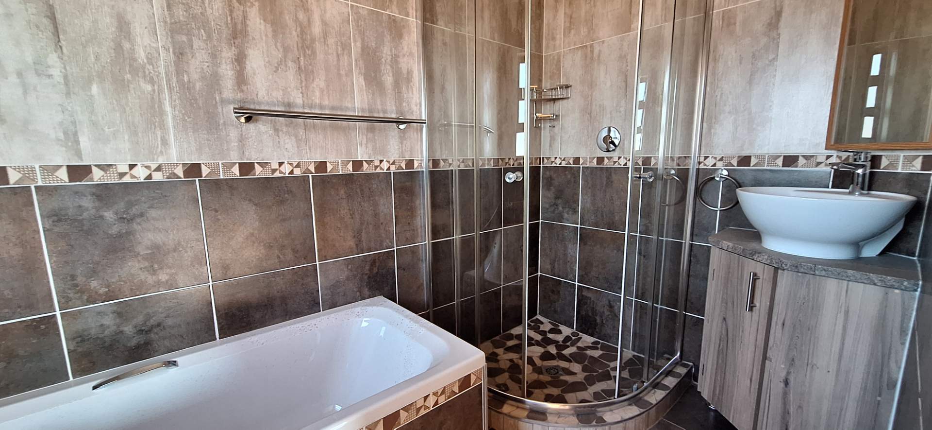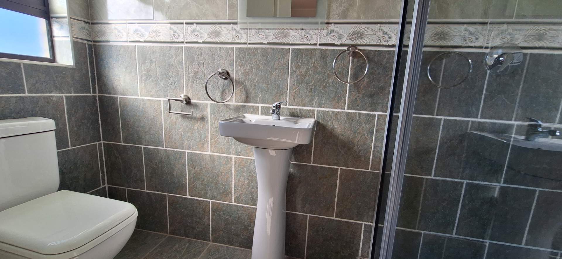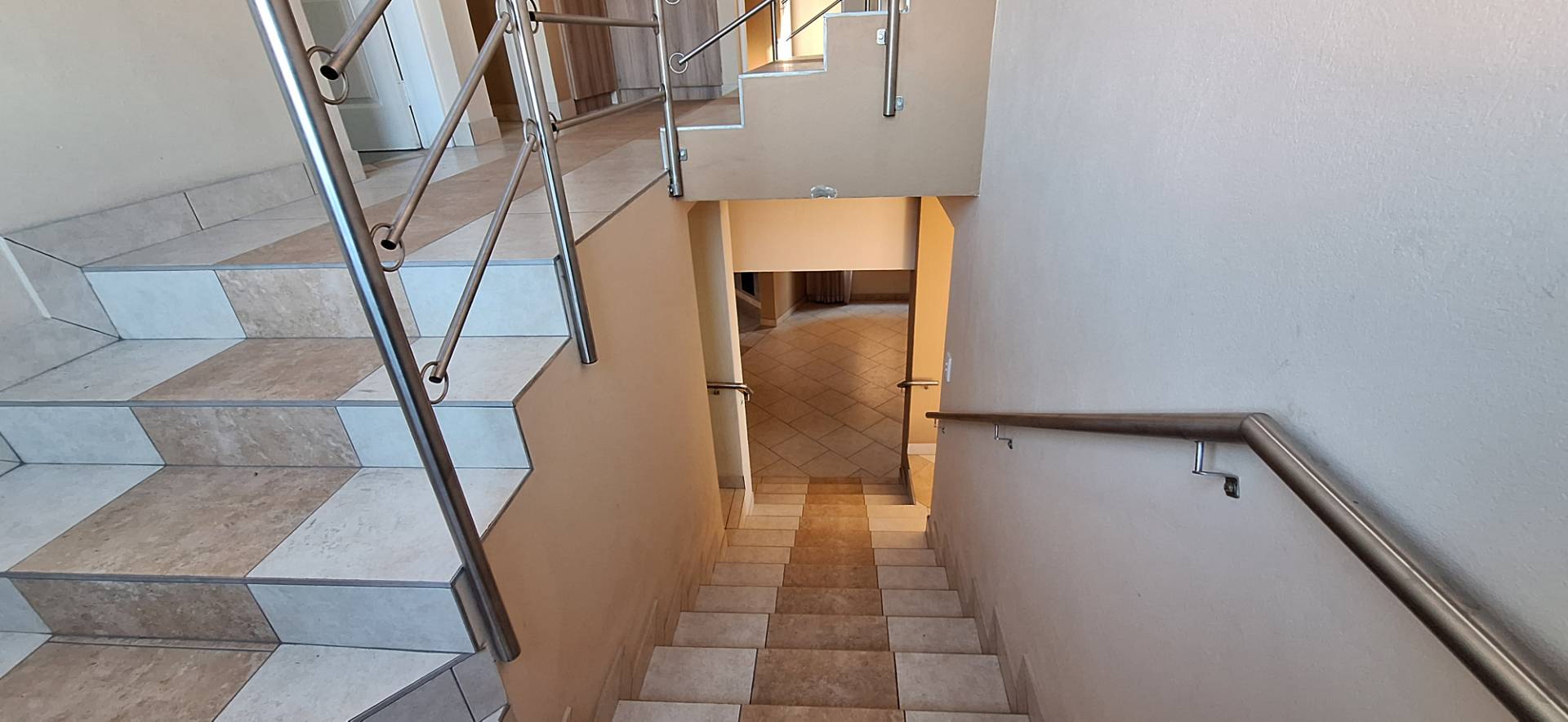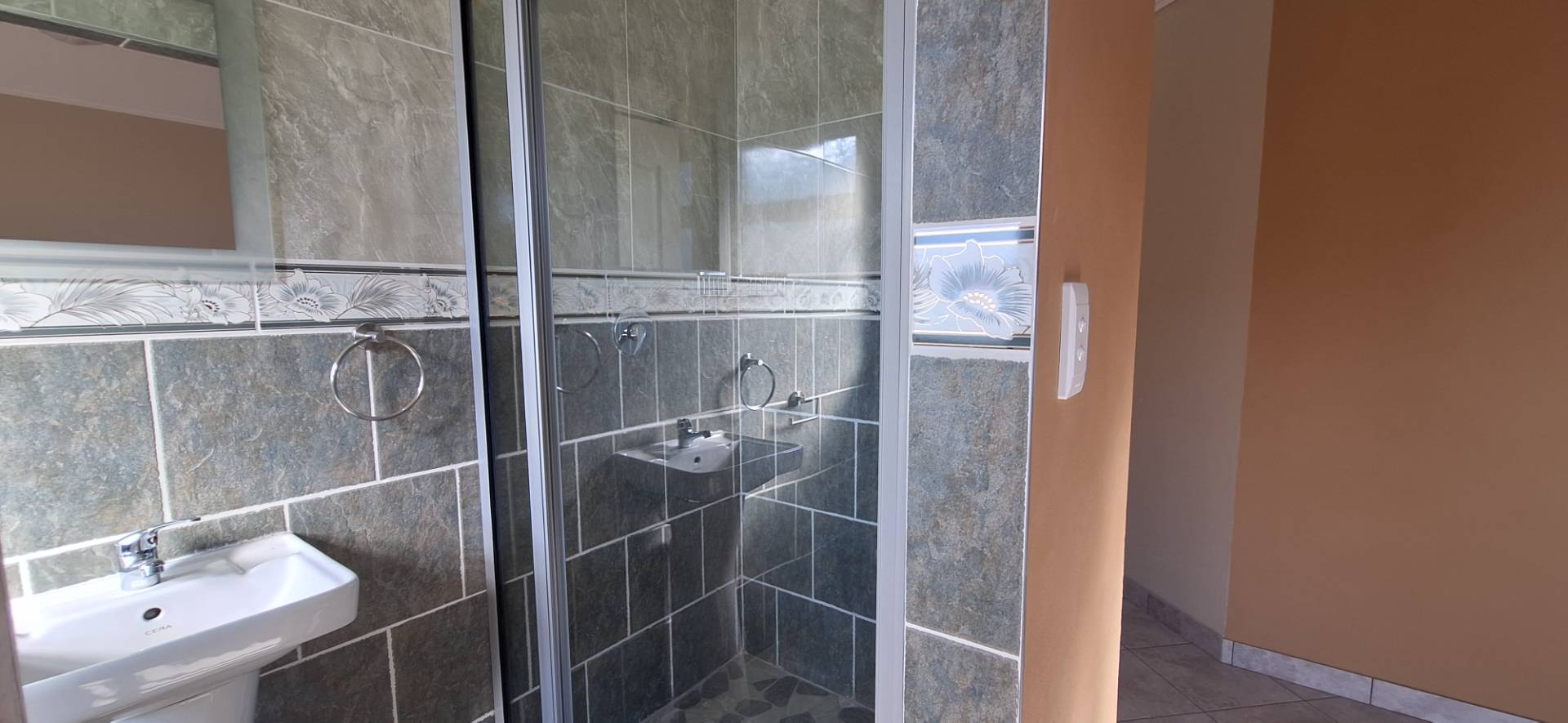 This home is adorned with modern finishes throughout, including aluminum window frames and stainless steel staircase railings. The outbuildings offer additional living space—a domestic room with an open-plan loo and basin and a bachelor pad complete with aluminum sliding doors, a kitchenette, and a small lounge and bedroom area with en-suite bathroom, beautifully tiled, which offers a loo, basin and shower. This space is perfect for a teenager or a family member seeking privacy.