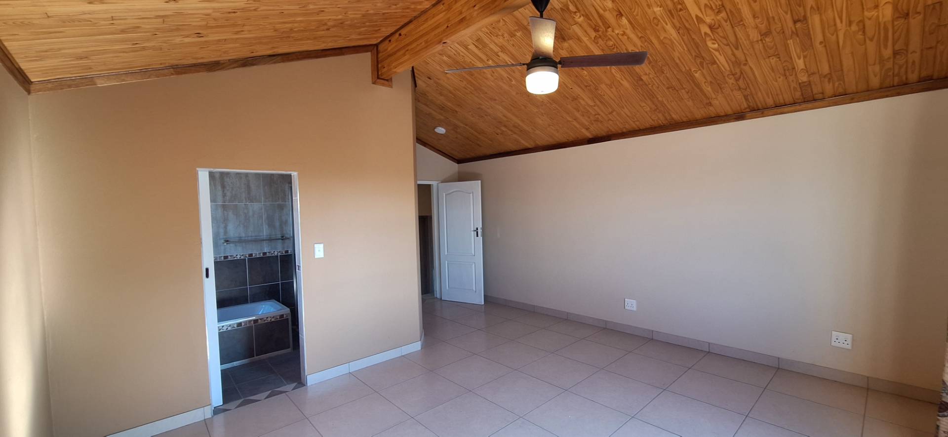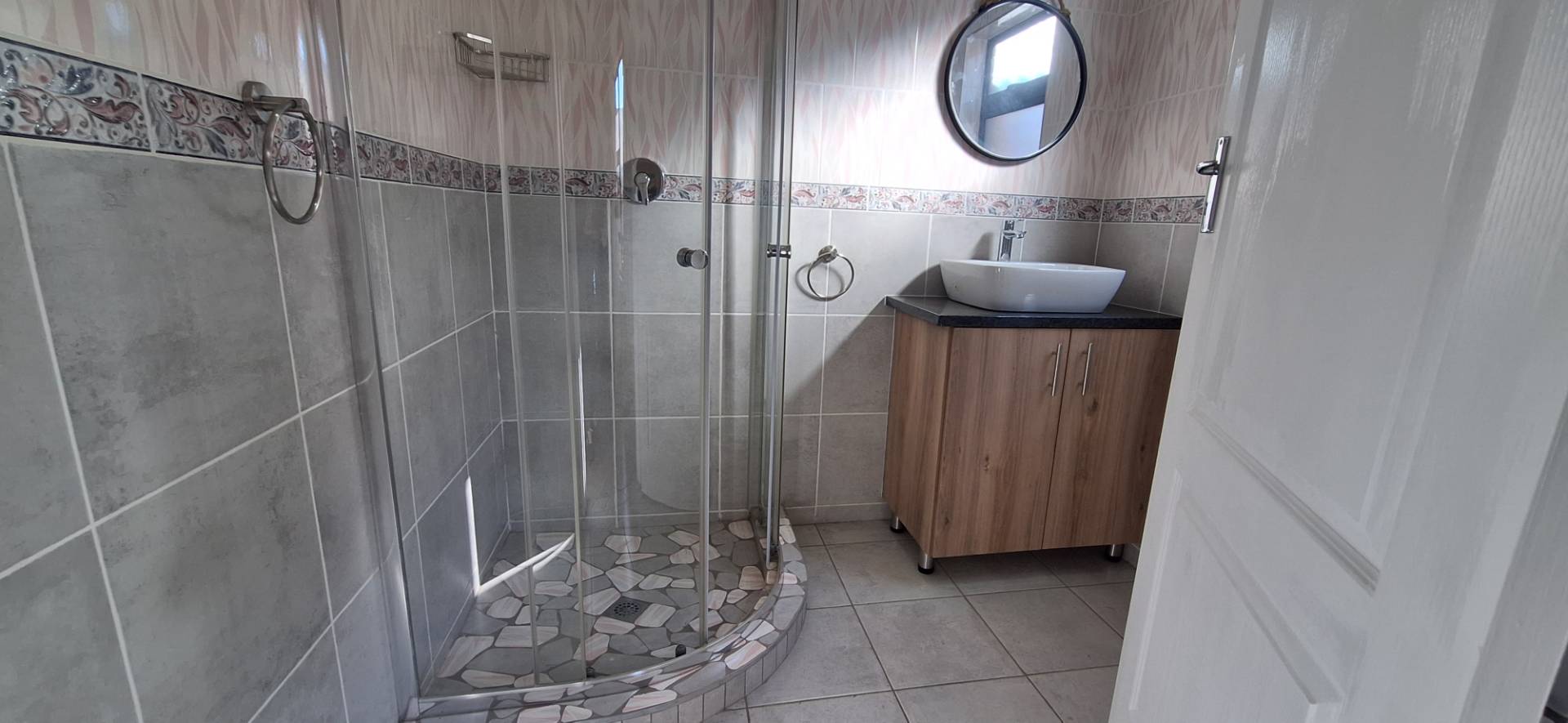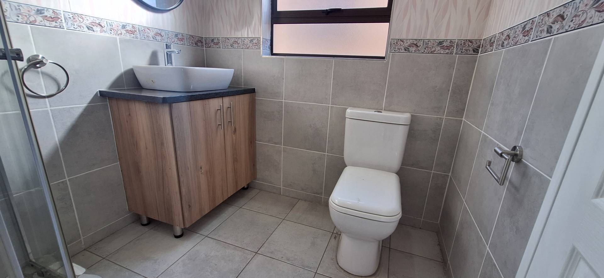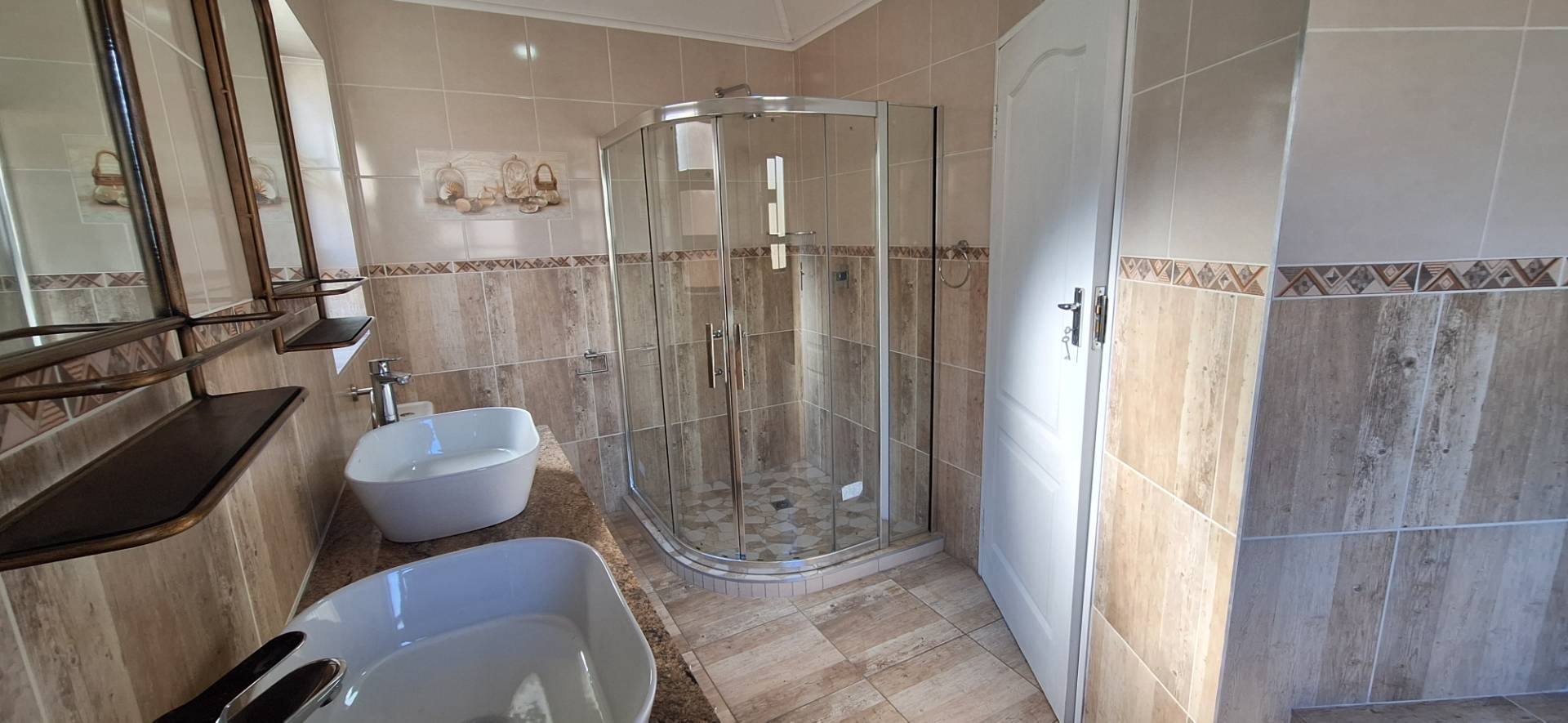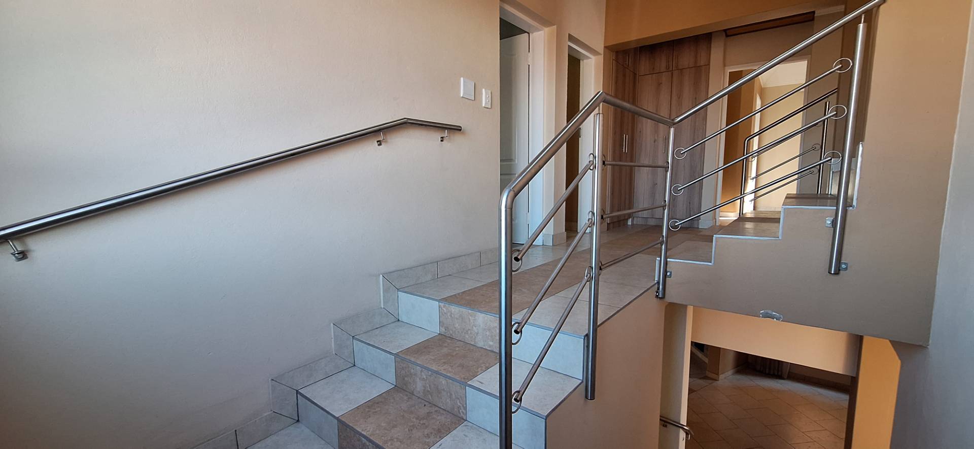 This home is adorned with modern finishes throughout, including aluminum window frames and stainless steel staircase railings. The outbuildings offer additional living space—a domestic room with an open-plan loo and basin and a bachelor pad complete with aluminum sliding doors, a kitchenette, and a small lounge and bedroom area with en-suite bathroom, beautifully tiled, which offers a loo, basin and shower. This space is perfect for a teenager or a family member seeking privacy.