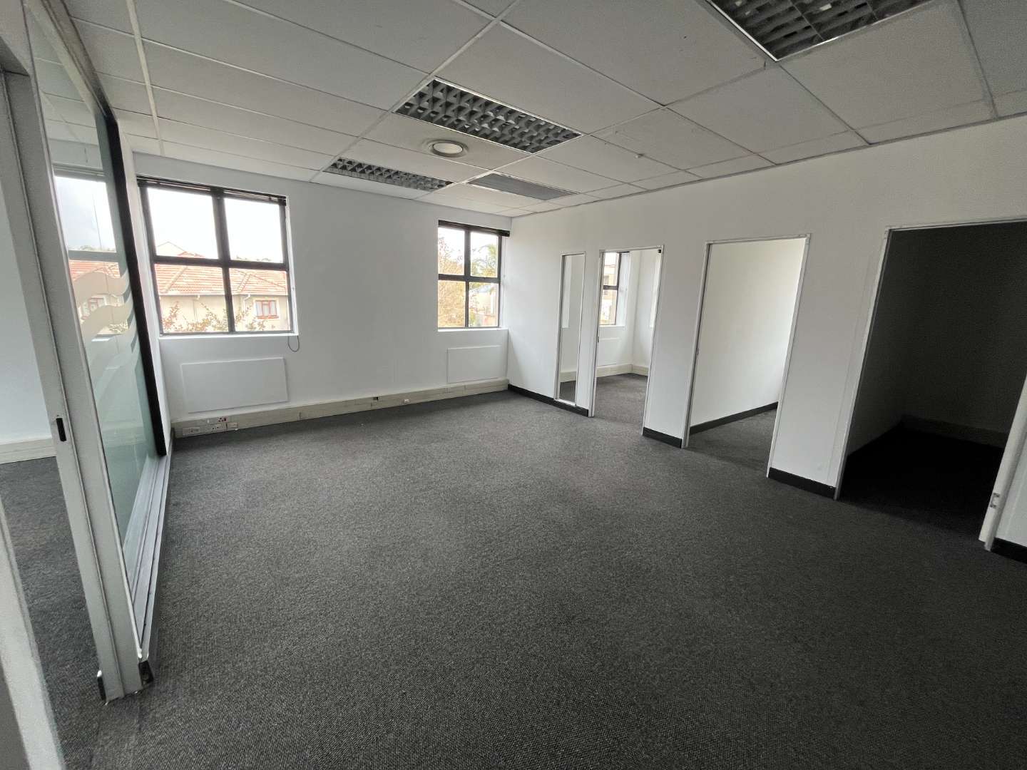 Multifunctional office space with enclosed private offices.